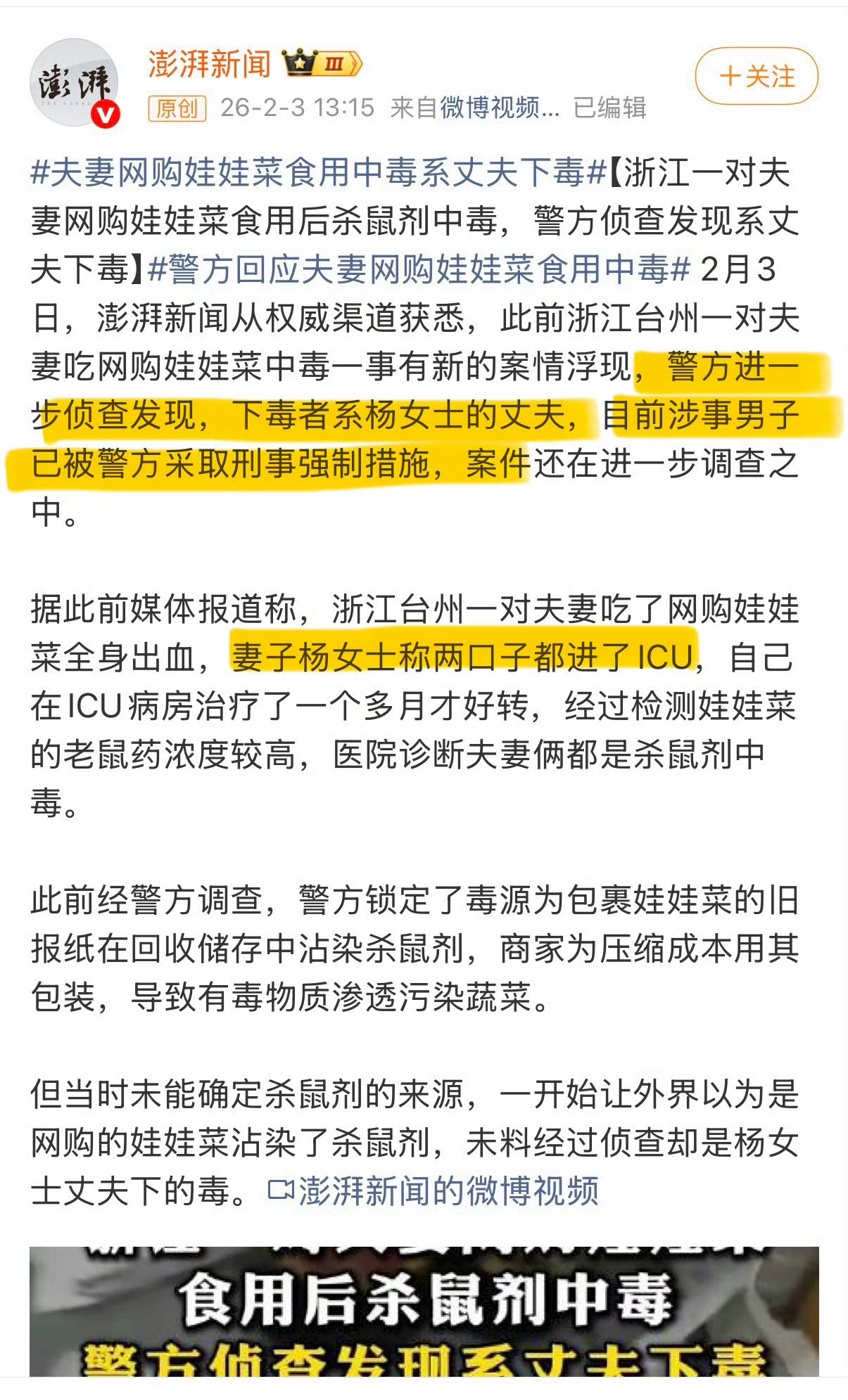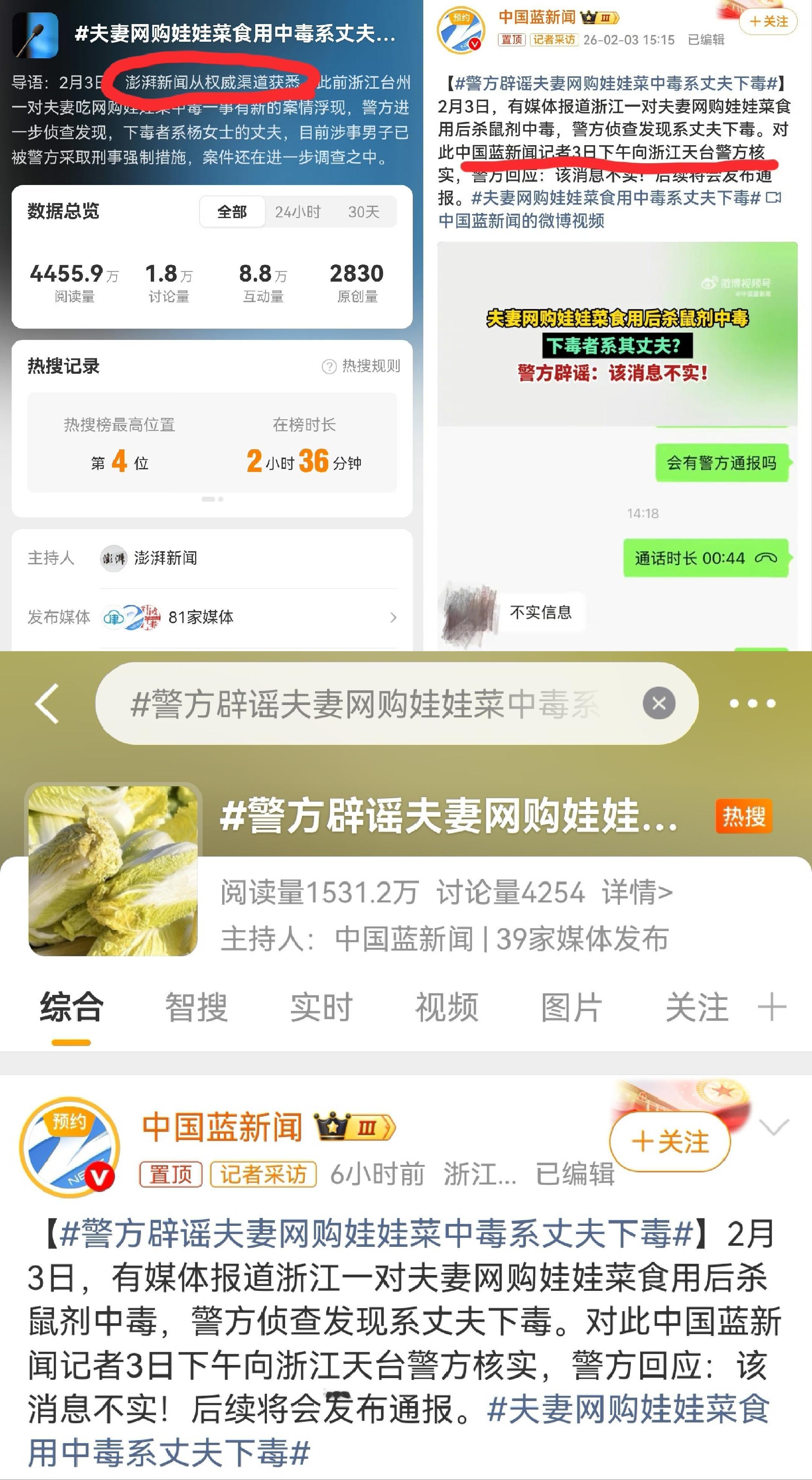 2月3日,澎湃新闻为了抢首发,以“权威渠道”获悉称是丈夫下毒,随后被中国蓝新闻辟谣称警方回复“消息不实”,澎湃“果断”删除相关报道,再到红星新闻发布“夫妻合谋”报道,媒体间的“信息互掐”,让公众无所适从,不知道该相信哪一方,媒体公信力再次被透支。吃娃娃菜中毒夫妻均被刑拘