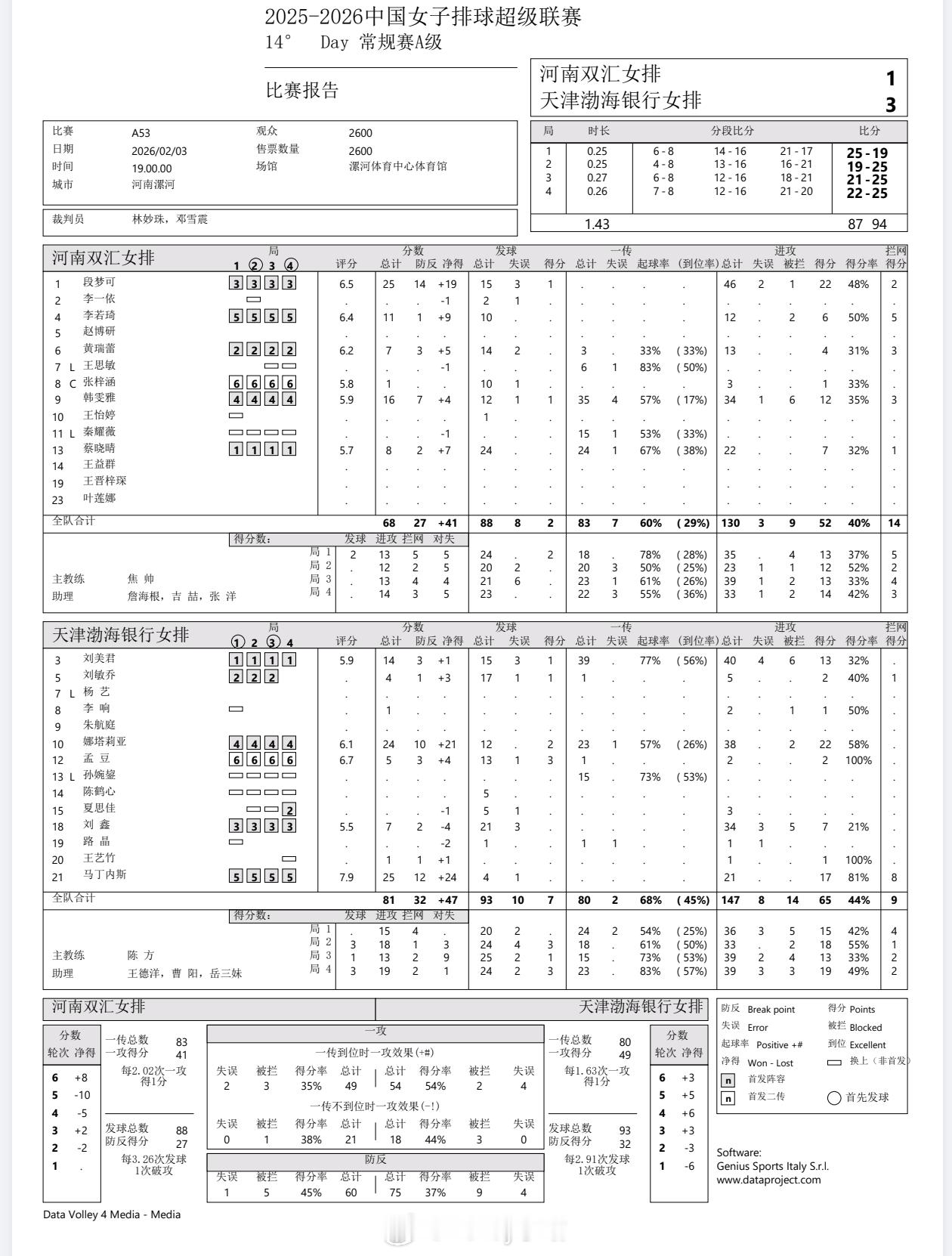 【技术统计】排超联赛第14轮,河南女排1比3天津女排(25-19 19-25 2