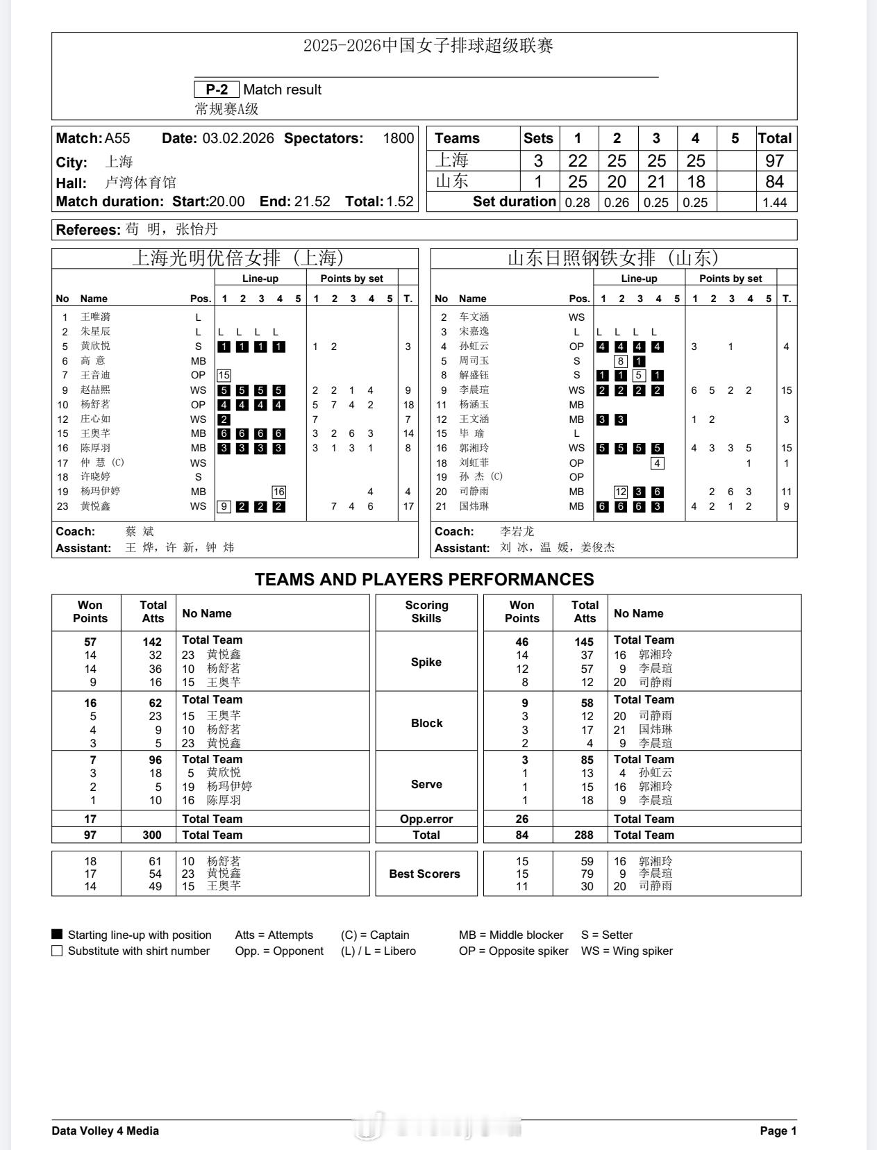 【技术统计】排超联赛第14轮,上海女排3比1山东女排(22-25 25-20 2