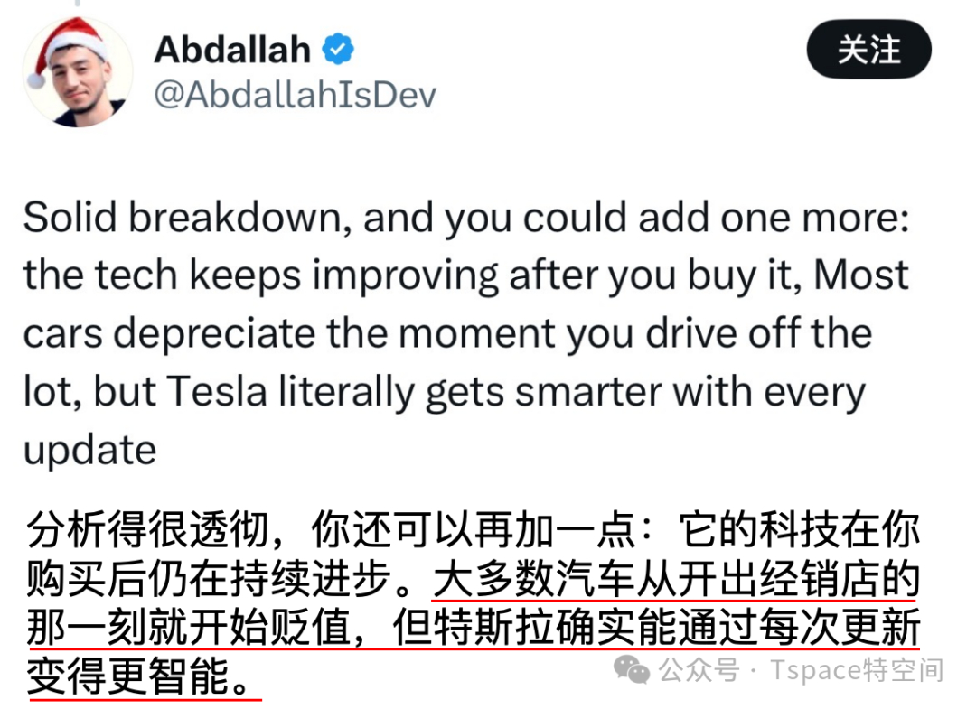 正如海外博主AbdallahIsDev 所言:“传统乘用车从开出经销店那一刻就开始贬值,而特斯拉却能做到每次远程软件升级都能让车变得更实用、更智能。”