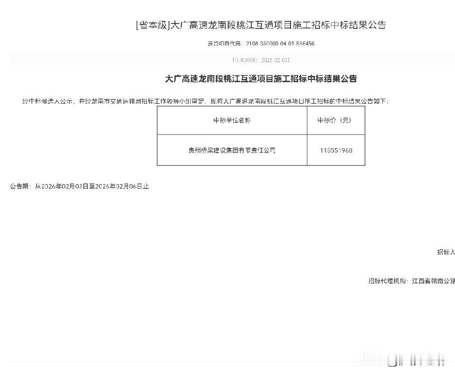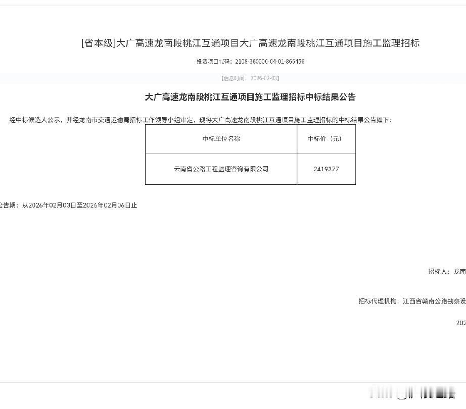 赣州龙南市新增 桃江互通施工监理和施工招标中标结果公告发布 一:施工监理中标结果公告如下: 中标单位名称: 云南省公路工程监理咨询有限公司 中标价(元):2419377 二:施工招标中标结果公告如下: 中标单位名称: 贵州桥梁建设集团有限责任公司 中标价(元):118551968