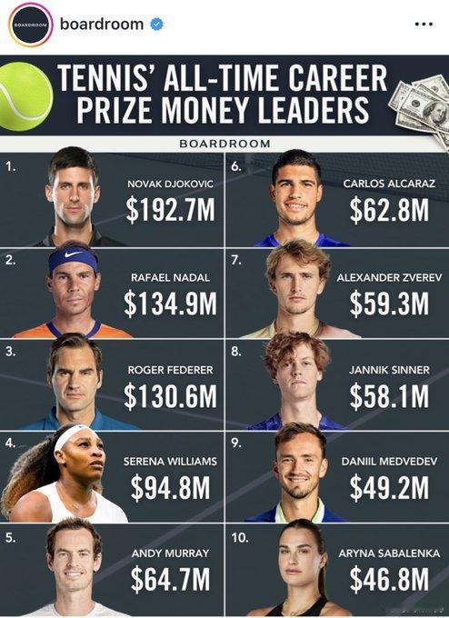 网球运动员生涯奖金排行榜。 德约科维奇正越来越靠近2亿美金。 阿卡拉斯已经来到第六位。