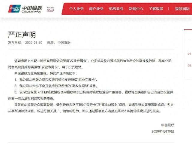 近期市场上出现一种带有银联标识所谓“农业专属卡”。公安机关及监管机关已接到群众的举报及信访,称有公司诱使其投资并购买该等“农业专属卡”,用于投资理财。