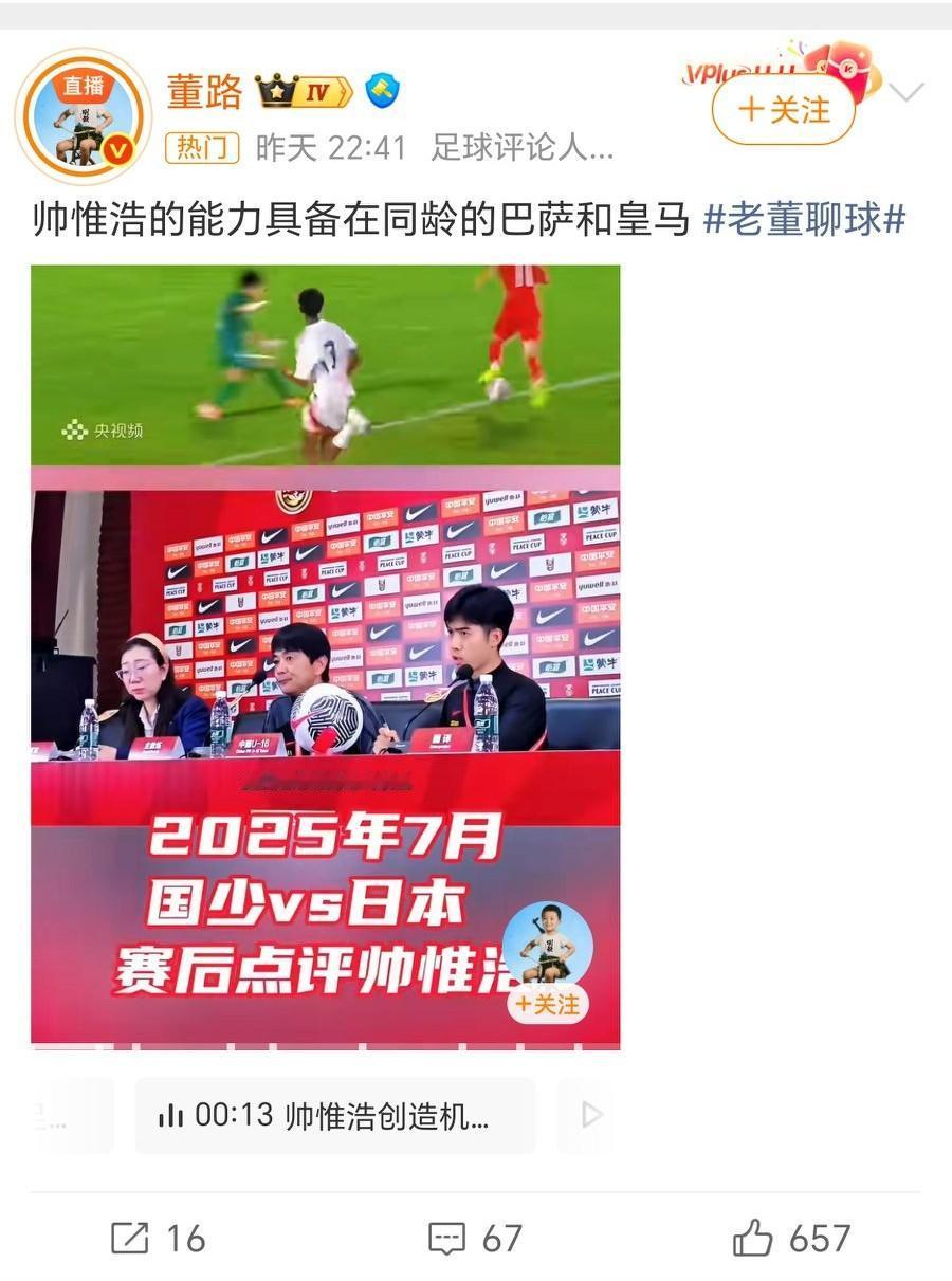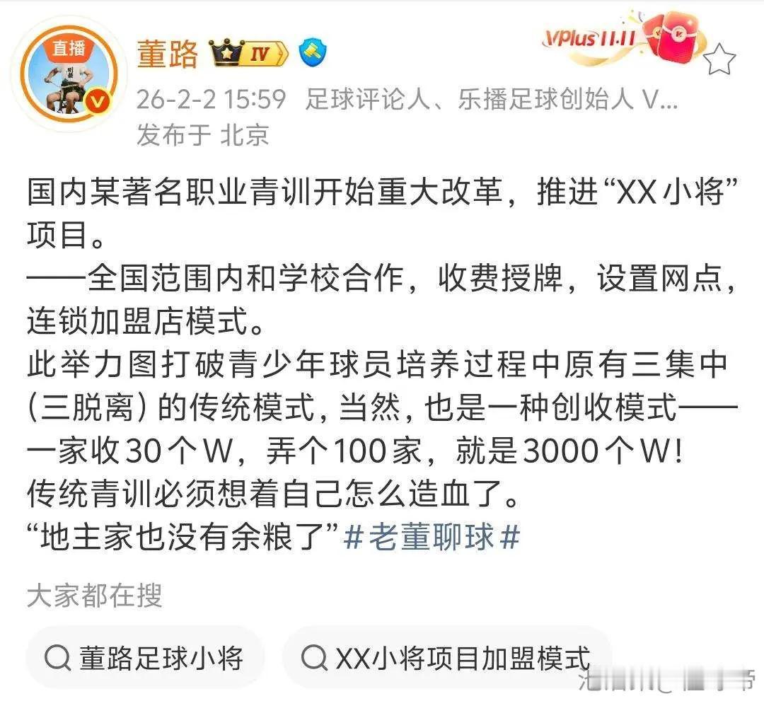 董路公开和鲁能青训杠上了? 看了泰山队发布的关于青训冬令营的文章,然后董路发文评价,感觉董路无论看什么事情,首先想到的就是钱。一切的直播、足球小将的视频、卖货等等,说的最多的不是足球知识。而是播放量,卖了多少票等等。 鲁能足校组织的一次活动,跟你也没关系。非得发文阴阳两句。这不就是故意而为之,这就是很多厌烦他的一个原因。鲁能青训可从来没说你啥吧! 还有成都蓉城的帅惟浩。你是真夸还是阴阳,大家也心知肚明。 总有人说有些人团结起来故意搞董路,你看看下边他说的话,不是找怼吗!山东泰山队