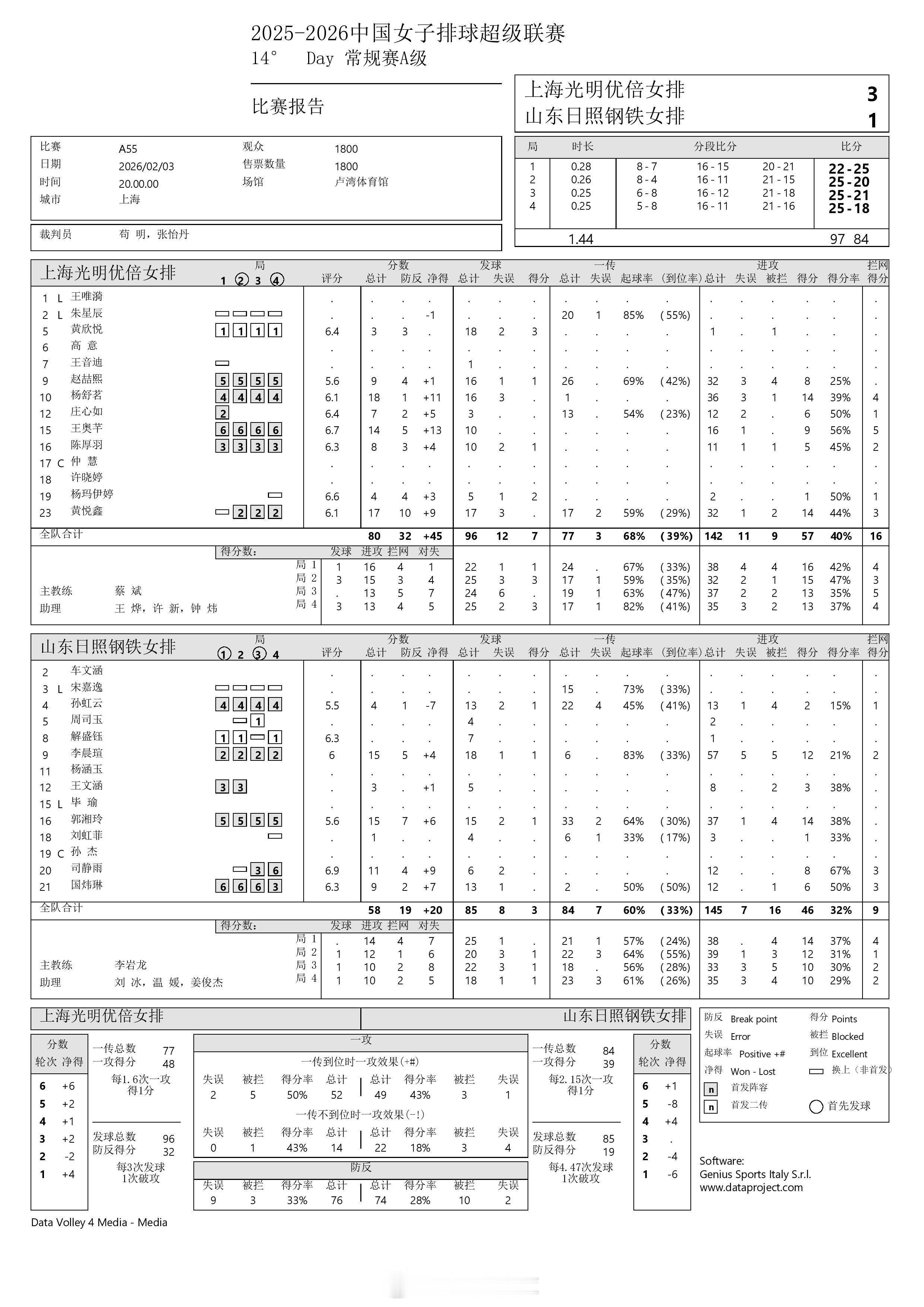 中国女排超级联赛 A级常规赛末轮,上海3-1逆转山东。杨舒茗18分全场最高,王奥芊拦网5分。