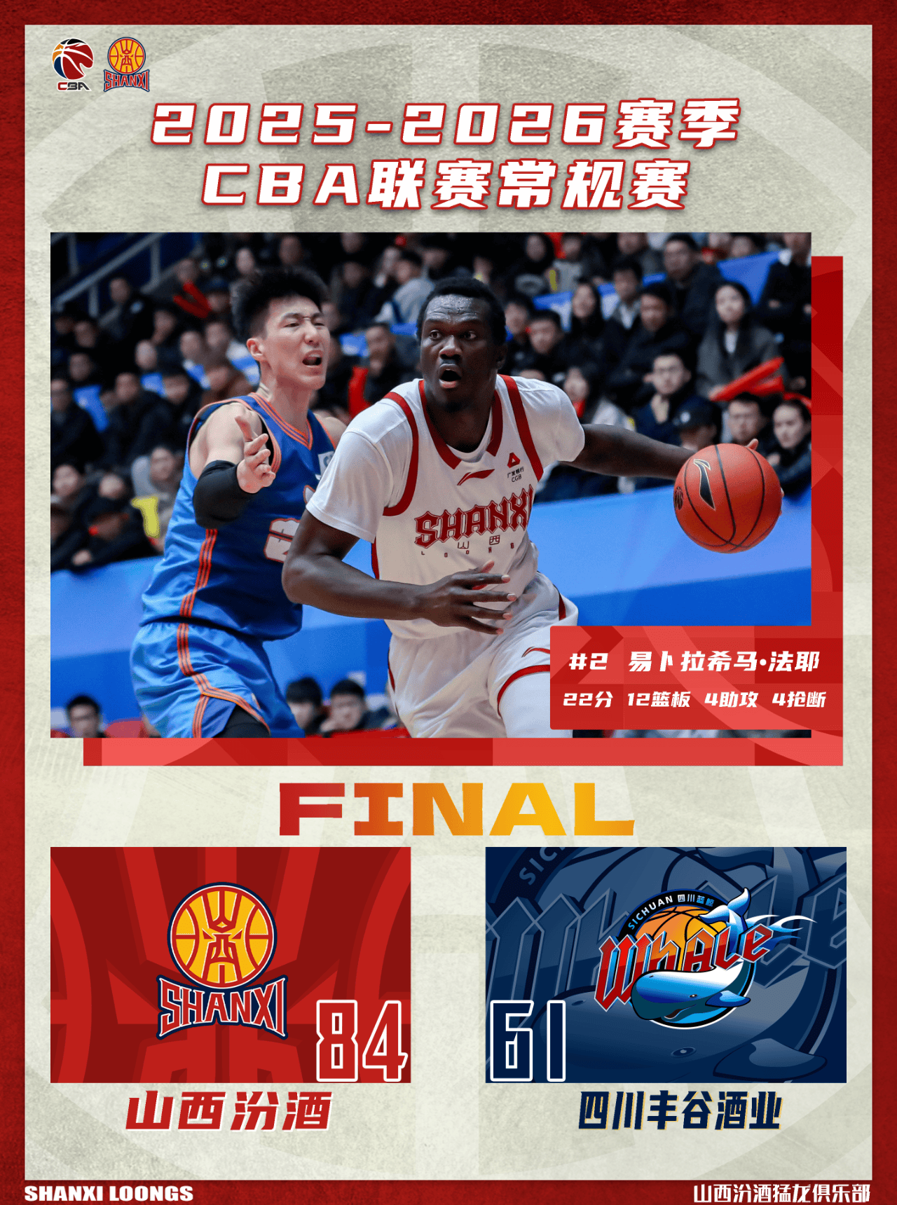 配文:北京时间2026年2月3日19:35,2025-2026赛季CBA联赛常规赛第23轮继续进行,山西汾酒客场挑战四川丰谷酒业。两队历史上共交手32次,山西汾酒19胜13负,上赛季常规赛两队交手4次,山西汾酒3胜1负;本赛季两队交手1次,山西汾酒1胜0负。本场比赛,山西队虽取得胜利,但全队在防守上不够专注,尤其是上半场对重点人的盯防和篮板球的保护不够好,半场调整后有所改善,第三节一鼓作气锁定胜局,最终全场比赛结束,山西汾酒84:61战胜四川丰谷酒业,山西队以一场胜利在春节假期前顺利收官!