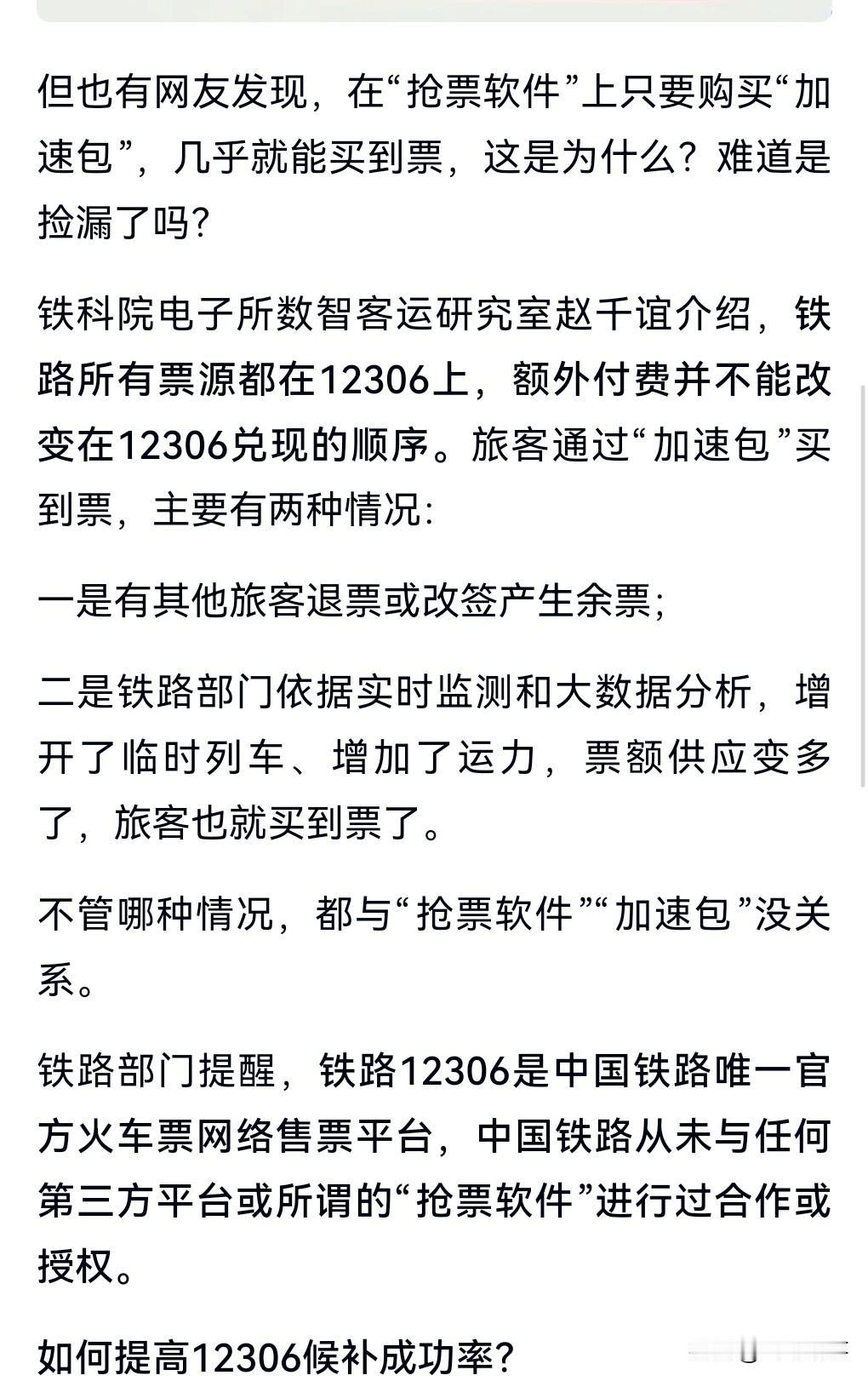 这也太惊人了吧!原来抢票软件和加速包是骗局来的。 能不能候补抢到票跟抢票软件和加速包没半点关系。 这真是涨知识。 所以花钱买加速包是不靠谱的。 那么既然是骗局的话,那有关部门一定要整治这种乱象。