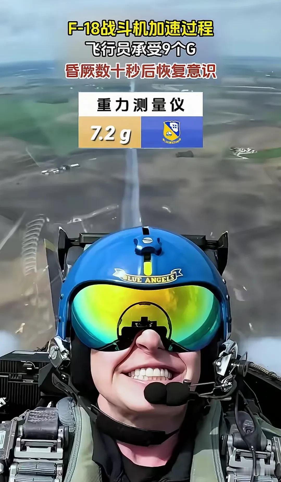 美国运动员乘坐F18大黄蜂战斗机体验9G加速度,结果刚超过7G就承受不住晕厥。所以说战斗机飞行员是金贵的,他们不仅需要异于常人的身体素质、还需要有高超的战斗机驾驶技术,以及执行灵活多变的战斗思维头脑,真是万中无一。 我们生活中普遍的能够体验到的加速度例如:高速电梯能够达到0.8G,普通客机加速阶段可以达到1.3G左右,性能跑车能够达到2G加速,F1顶级赛车最大加速度可以达到4G,超级跳楼机制动阶段能够达到5G加速度,而战斗机暴力加速时可以超过9G。 运动员体验F18战斗机加速度晕厥
