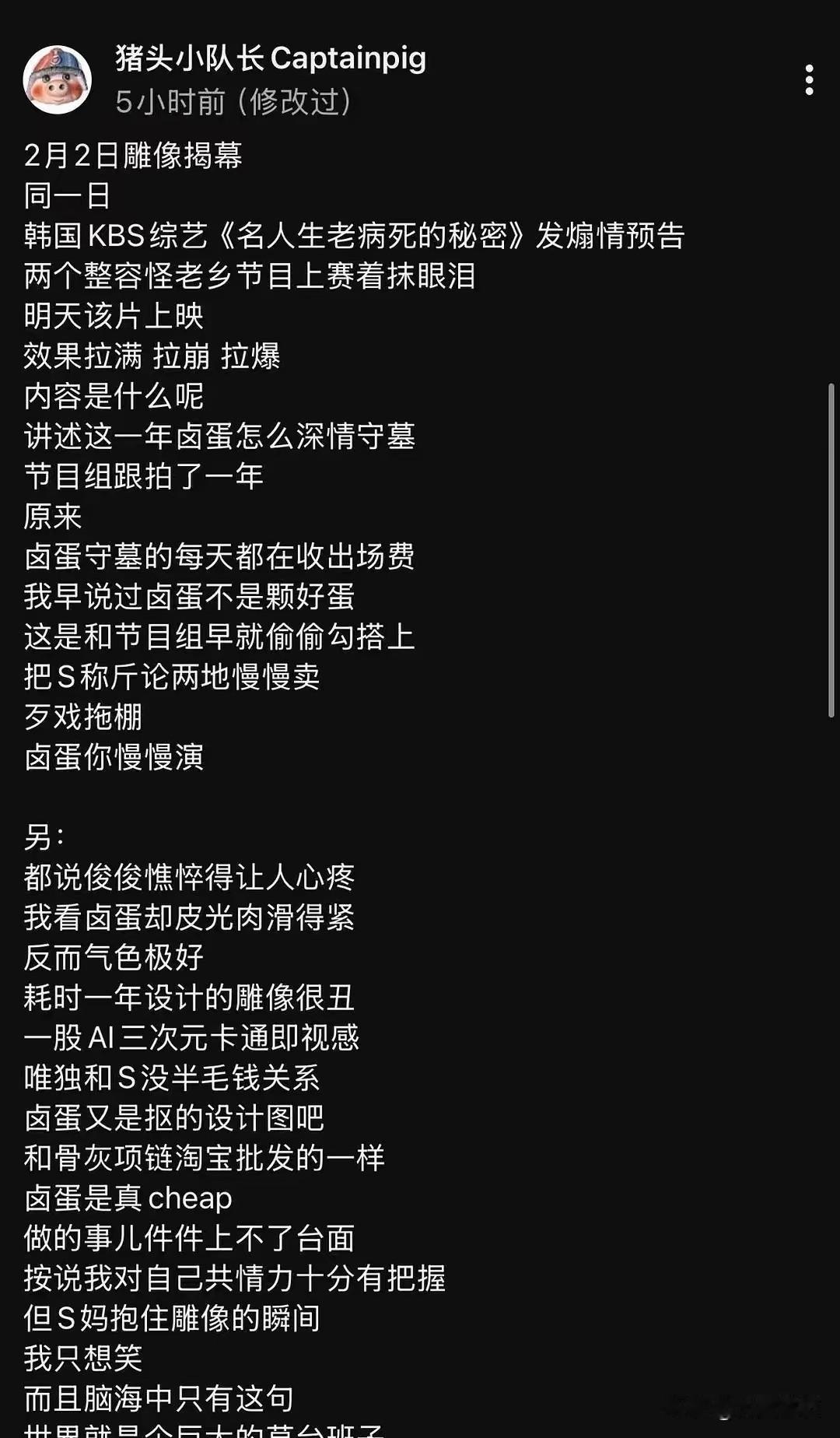 具俊晔每天去墓地陪大S,说好听点是爱情,说实际点也是他在利 用大S赚通告费。 据网友爆料,具俊晔每天去墓地陪大S,原来是有通告费的。2月3日,韩国kbs2台开始播放具俊晔和大S的爱情故事,这是kbs历时大半年,每天跟拍具俊晔去墓地陪大S。 一直以来,不少人认为具俊晔每天去墓地陪大S,可能和爱情无关,更像是一种行为艺术,没想到这种猜想,在大S忌日这天得到了证实。 S妈曾自曝忌日那天没有请媒体,可具俊晔却请了专业人员全程跟拍,每一个细节都不错过,大S的雕像是具俊晔设计的,雕像揭幕是具俊晔全程参与,这些资料掌握在具俊晔手里,随便曝一个都能上热搜。 再看小S的致辞,句句不离具俊晔,全场的焦点都在他身上,再加上韩国电视推波助澜,大S的忌日,几乎成了具俊晔的复出之日,而且还有工资。