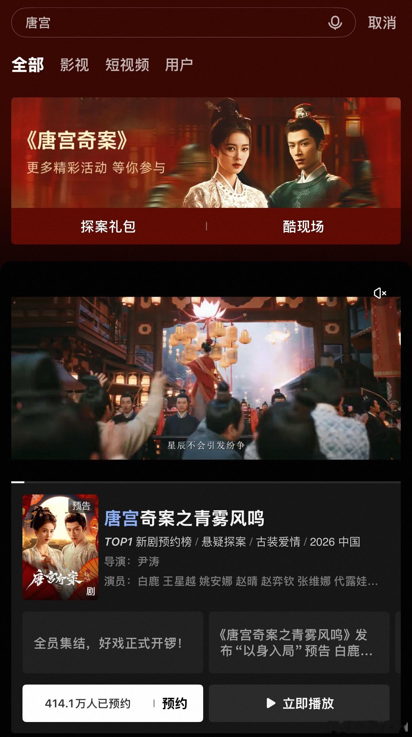 离开播还有两天,《唐宫奇案之青雾凤鸣》站内热度已经破5215,预约人数已破414万