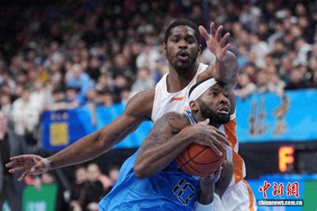 2月3日,2025-2026赛季中国男子篮球职业联赛(CBA)常规赛,北京北汽队主场85:77战胜福建晋江文旅队。图为北京北汽队杰曼(蓝衣)带球突破。中新社记者张祥毅摄