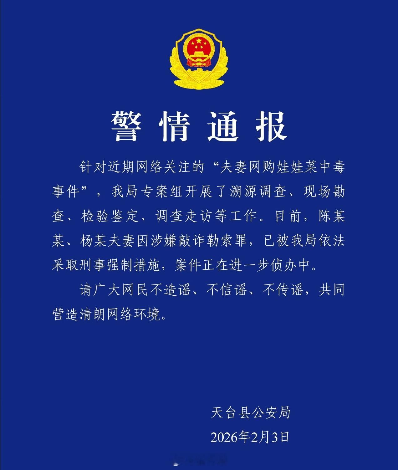 警方通报夫妻网购娃娃菜食用中毒吃娃娃菜中毒夫妻均被刑拘神了!案件反转?再反转!一开始:警方锁定毒源为包裹娃娃菜的旧报纸沾染杀鼠剂(溴鼠灵),商家因使用非食品级包装致污染; 首次反转(2月3日):部分媒体称"丈夫投毒",称其清洗蔬菜时投放毒物伪装事故;再次反转:天台警方通过中国蓝新闻否认"丈夫下毒"说法;二次反转:红星新闻援引"官方人士"称系夫妻合谋骗赔,二人均被刑拘不是吧?为了讹诈一点钱,连老鼠药都敢吃