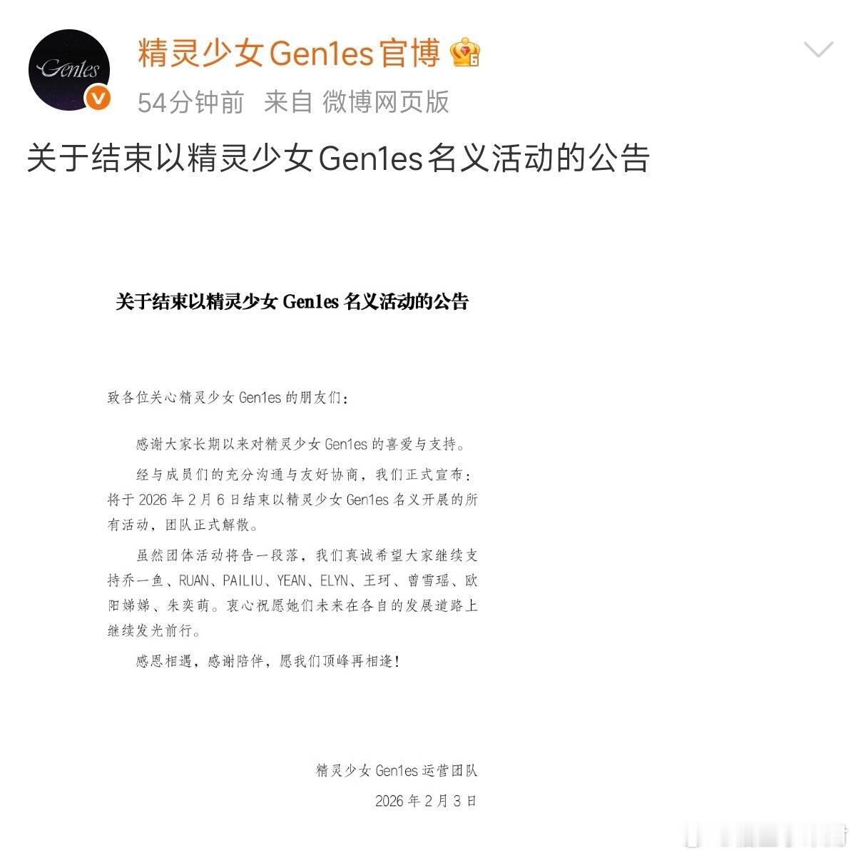 《创造营亚洲》出道的女团精灵少女宣布解散节目是2024年播的,乔一鱼、RUAN、PAILIU、YEAN、ELYN、王珂、曾雪瑶、欧阳娣娣、EMMA朱奕萌于当年4月6号正式成团出道,限定活动期为三年,但现在两年都不到就宣布解散。