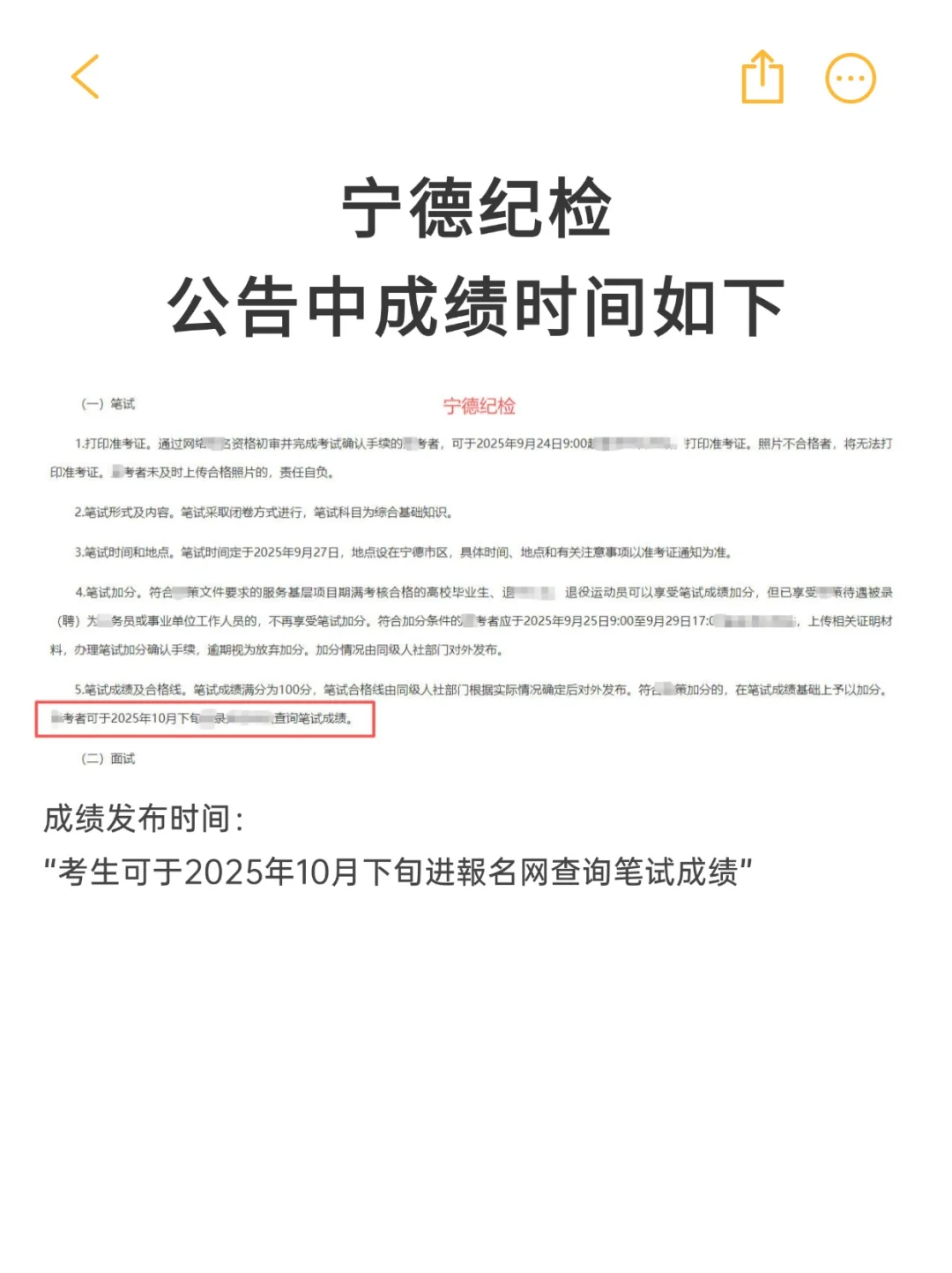 1、本次927联考 宁德纪检 在公告中提到了成绩发布时间:“考生可于2025年10月下旬查询笔试成绩” 2、其他地区公告中没有说明,上图是小编根据往年笔试和出成绩时间推测而得,大概10月下旬,仅供参考!