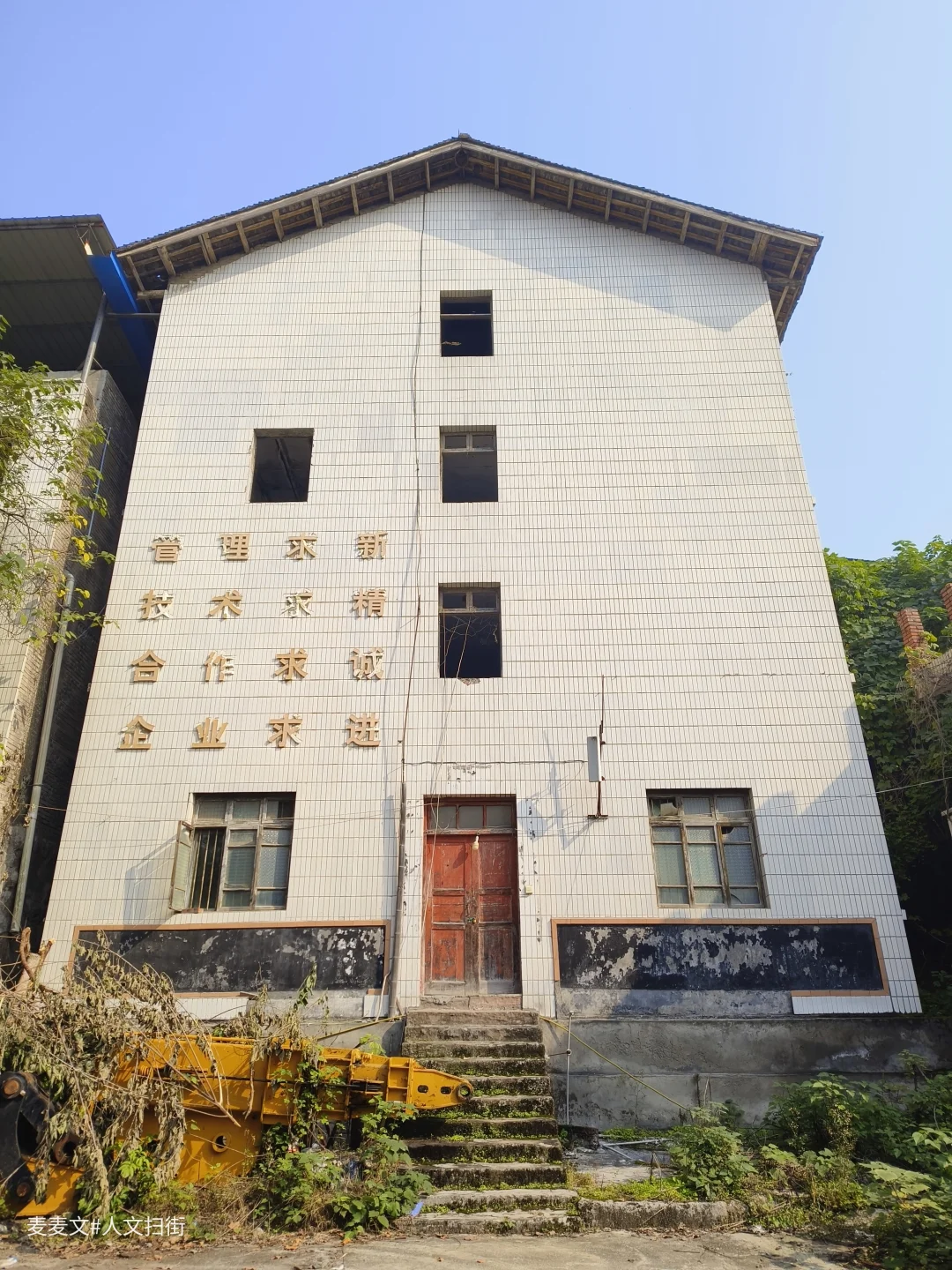 眼前的生产主塔早已爬满青藤,巨大的立窑设备在荒草里沉默。办公楼墙上“管理求新、技术求精”的标语仍清晰可见,仿佛还能听见当年车间里的轰鸣与职工食堂的喧闹。