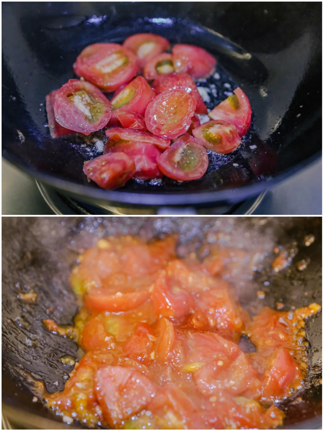 [草莓R]锅烧热之后加入葱姜末炒香加入番茄块,喜欢味道浓郁一些,可以放些番茄酱,炒出红色的汁液之后加入开水,放入盐和白胡椒粉调味。
