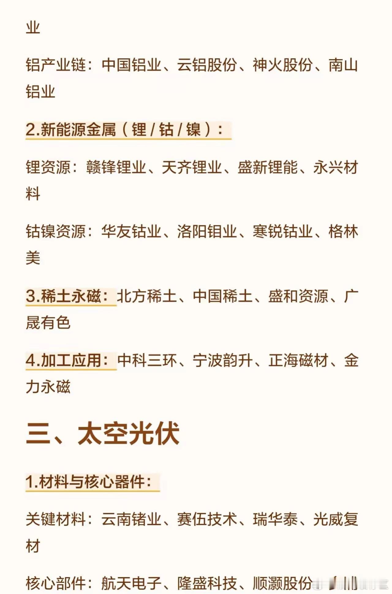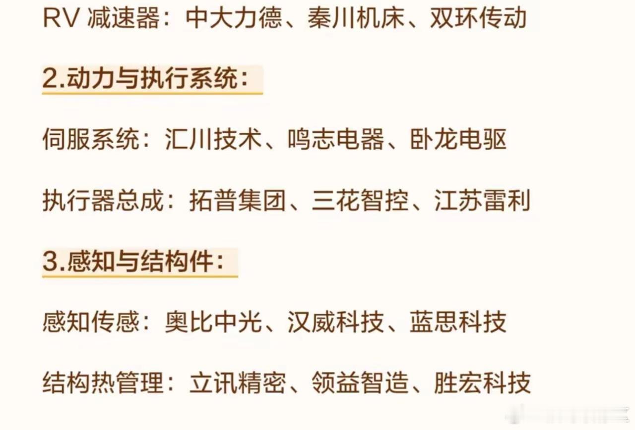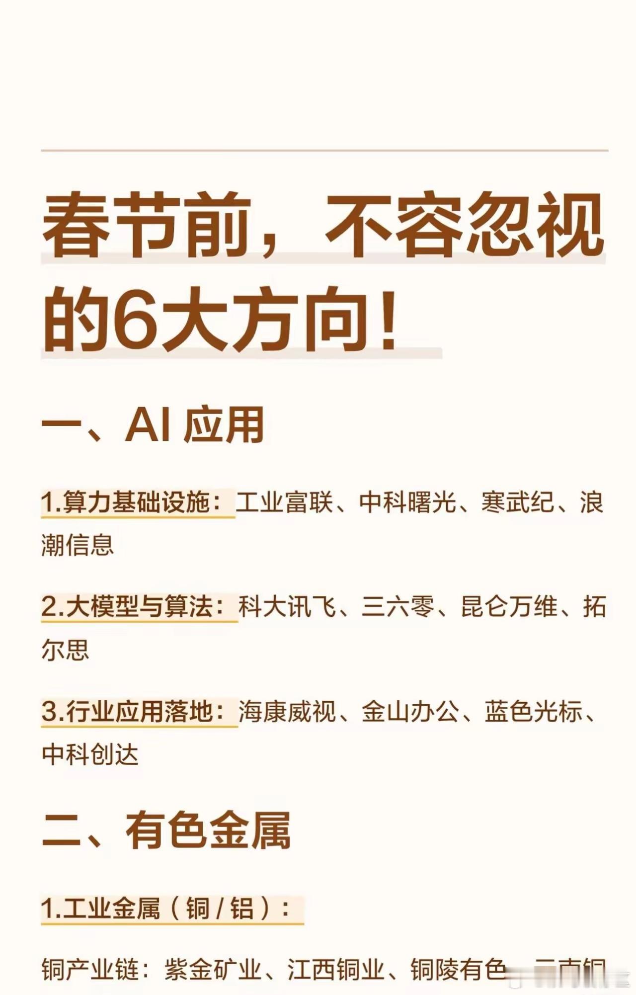 春节前,不容忽视的6大方向!一、AI 应用算力基础设施:核心企业:工业富联、中科曙光、寒武纪、浪潮信息大模型与算法:核心企业:科大讯飞、三六零、昆仑万维、拓尔思行业应用落地:核心企业:海康威视、金山办公、蓝色光标、中科创达二、有色金属工业金属(铜 / 铝):铜产业链:紫金矿业、江西铜业、铜陵有色、云南铜业铝产业链:中国铝业、云铝股份、神火股份、南山铝业新能源金属(锂 / 钴 / 镍):锂资源:赣锋锂业、天齐锂业、盛新锂能、永兴材料钴镍资源:华友钴业、洛阳钼业、寒锐钴业、格林美稀土永磁:核心企业:北方稀土、中国稀土、盛和资源、广晟有色加工应用:中科三环、宁波韵升、正海磁材、金力永磁三、太空光伏材料与核心器件:关键材料:云南锗业、赛伍技术、瑞华泰、光威复材核心部件:航天电子、隆盛科技、顺灏股份、多浦乐电池与设备制造:电池制造:乾照光电、东方日升、钧达股份、隆基绿能生产设备:迈为股份、捷佳伟创、先导智能财经知识春节股市系统集成与应用:集成服务:上海港湾、航天宏图、中国卫星场景落地:上海港湾(伏曦炉空)、众能光储四、芯片半导体设计与制造:芯片设计:兆易创新、寒武纪、澜起科技、韦尔股份晶圆制造:中芯国际、华虹公司、华润微、士兰微设备与材料:核心设备:北方华创、中微公司、拓荆科技、盛美上海关键材料:江丰电子、安集科技、华特气体、雅克科技封测与配套:封测龙头:长电科技、通富微电、华天科技、晶方科技配套服务:长川科技、华峰测控、上海新阳、南大光电五、商业航天火箭与卫星制造:核心企业:中国卫星、航天电子、臻镭科技、天银机电发射与地面设备:核心企业:中国卫通、航天发展、铖昌科技、上海瀚讯材料与先进制造:核心企业:光威复材、菲利华、西部超导、铂力特六、人形机器人精密传动系统:谐波减速器:绿的谐波、昊志机电、大族激光RV 减速器:中大力德、秦川机床、双环传动动力与执行系统:伺服系统:汇川技术、鸣志电器、卧龙电驱执行器总成:拓普集团、三花智控、江苏雷利奥科技;财经观察官