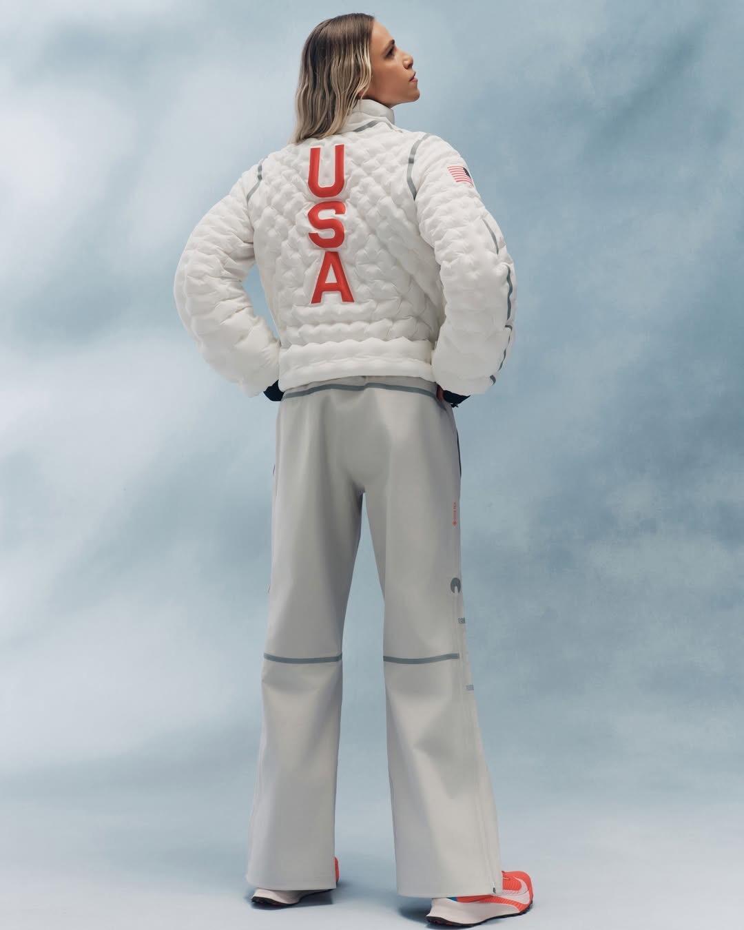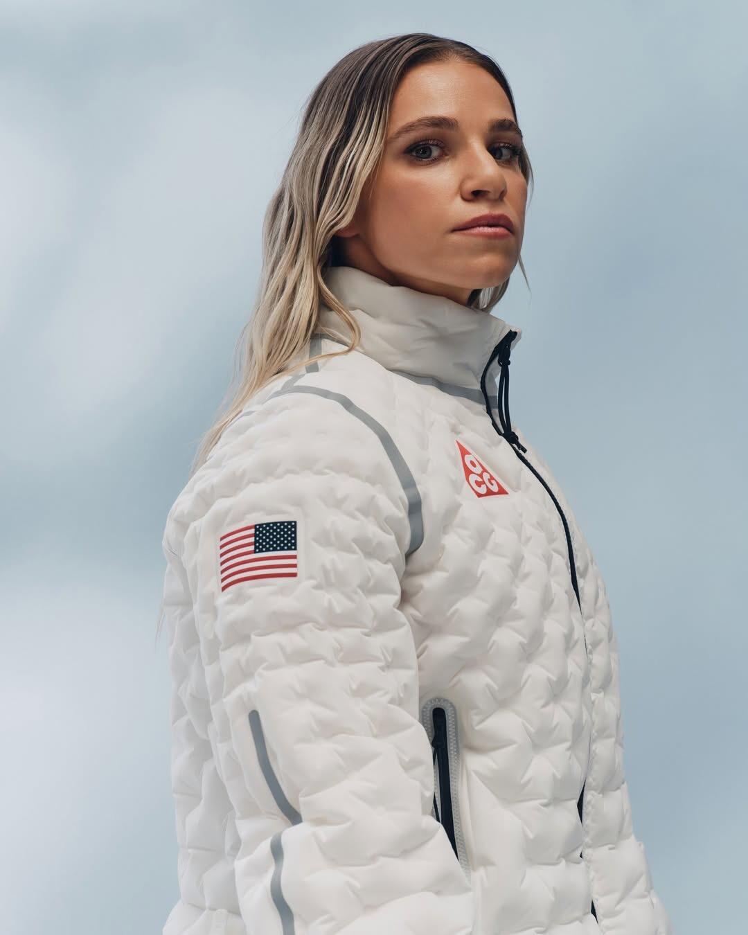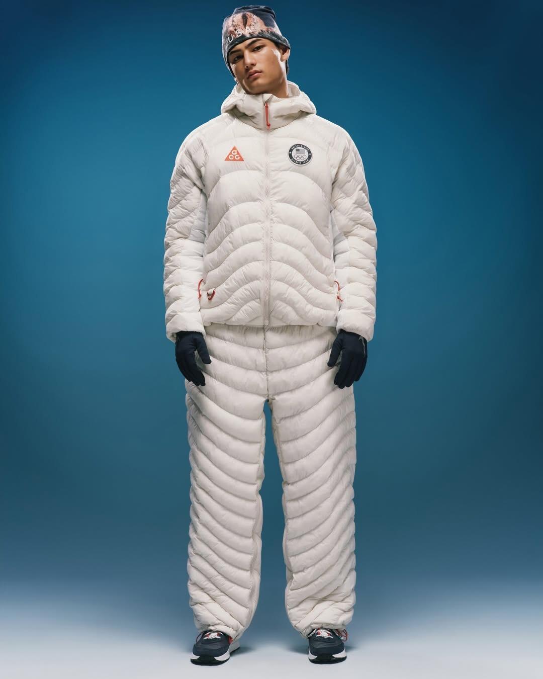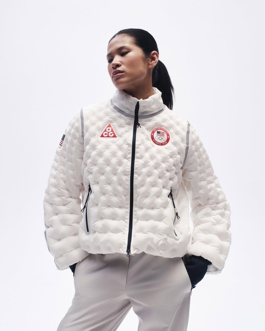 冬奥会时尚图鉴时尚灵感解读 Nike ACG为美国队推出冬奥系列,灵感源自科罗拉多自然景观,融入马尼图斜坡步道与众神花园元素。核心单品Therma-FIT Air Milano夹克采用双层复合结构,夹层空气调节系统可充气保暖、放气降温,精准控温。