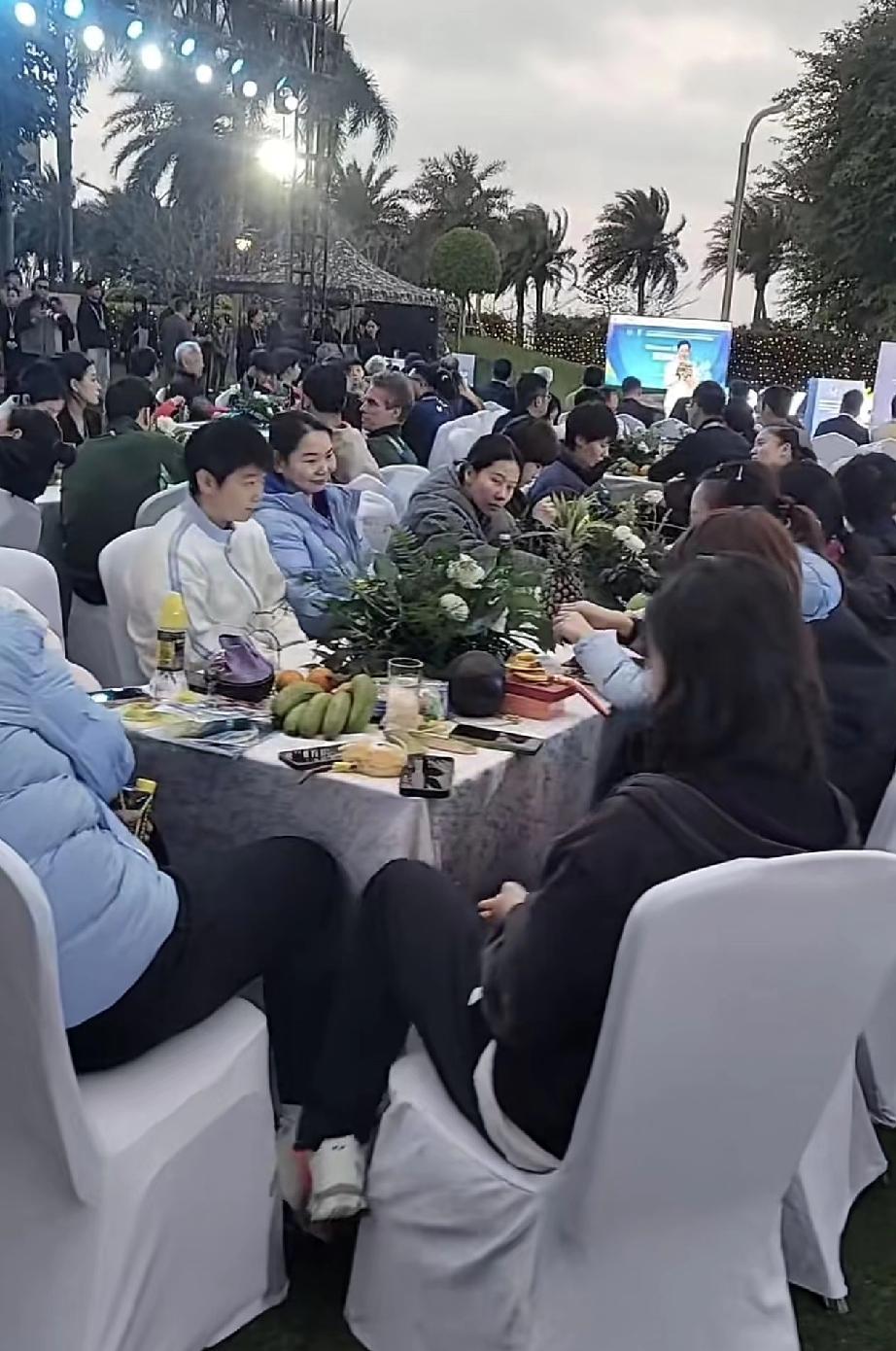海口亚洲杯欢迎晚宴,国乒男女队分坐在两大桌。女队一眼看到孙颖莎王曼昱何卓佳和陈幸同与女队队友同桌。莎莎还真是抗冻,曼昱和陈幸同何卓佳都穿着羽绒服,莎莎一个人只穿了个运动外套在户外。 男队一眼看到王楚钦穿着羽绒服,与体能教练杨先军和其他队友坐一桌。