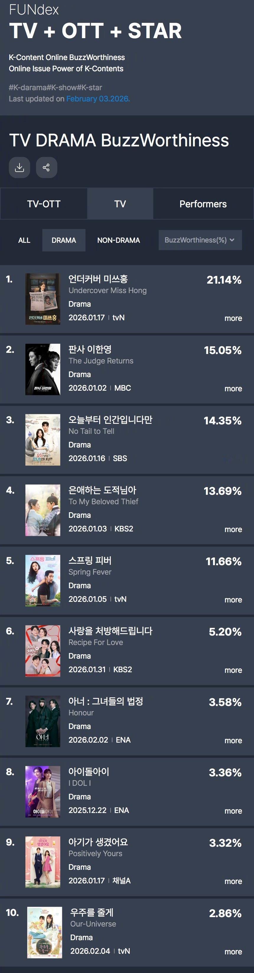 GOODDATA公布2026年1月第5周电视剧热度话题性排行。1.韩剧卧底洪小姐 21.14%2.法官李汉英 15.05%3.今天开始是人类 14.35%4.韩剧恩爱的盗贼大人 5.春日狂热 6.爱情处方签 7.荣耀:她们的法庭 8.偶像疯子 9.理事长和我的秘密关系 10.韩剧给你宇宙