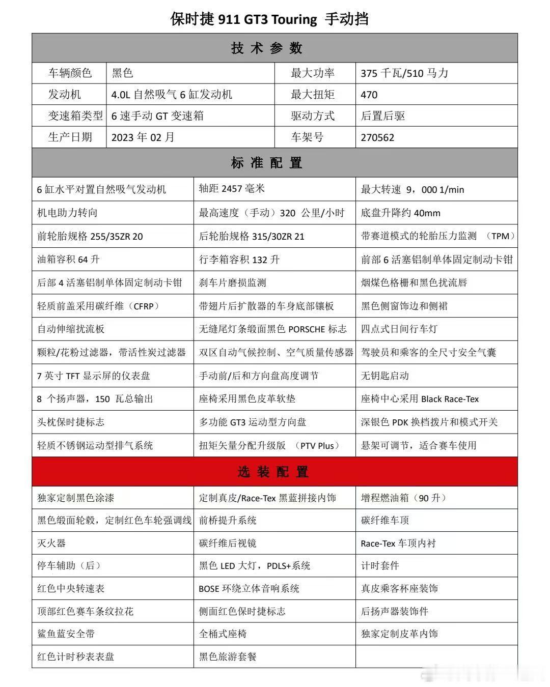 保时捷911 GT3 touring 旅行版,美规。手动,高定版配置碳顶,碳陶,