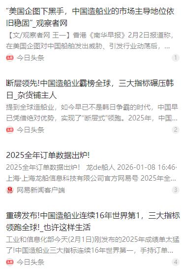 40艘大单直接砸向中国,韩国造船业拿到了全球62%的订单,韩媒马上狂欢,还扬言“重夺第一”,结果得意劲儿还没捂热,就被泼了盆冷水。 麻烦看官老爷们右上角点击一下“关注”,既方便您进行讨论和分享,又能给您带来不一样的参与感,感谢您的支持! 全球造船市场开年阶段,韩国船企凭借一批集中交付的高端订单,短暂拿下全球约 62% 的新船订单份额,多家韩媒随即集中发声,高调宣称韩国造船霸权回归,放话要重夺全球第一的位置,还反复强调本国在大型 LNG 船领域的长期主导优势。 这份亮眼开局让韩国业内普遍乐观,认为依靠高附加值船型的技术壁垒,能够快速缩小与中国的差距,甚至实现反超,不少分析文章将短期份额反弹,当作行业格局逆转的信号,舆论氛围十分高涨。 没过多久,中国船企接连敲定总计 40 艘的大额船舶订单,其中包含多艘大型 LNG 船与高端双燃料集装箱船,随着自主薄膜舱等核心技术实现稳定量产与应用,正式打破韩国在该领域长期占据的技术与市场垄断。 这一批订单涵盖主流绿色船型与高附加值船型,既体现船东对中国建造质量与交付周期的认可,也标志着中国造船在高端赛道完成从追赶并跑到并行领跑的转变,直接打断韩国的乐观预期。 工信部公开数据显示,2024 年前三季度,中国造船完工量、新接订单量、手持订单量三大核心指标,以载重吨计分别占全球 55.1%、74.7%、61.4%,三项数据均创下同期历史新高。 这一阶段全球新增订单向中国集中的趋势明显,无论总量还是增速,都拉开与韩国的差距,也为后续全年稳定领跑奠定基础,并非偶然的阶段性波动。 2025 年完整数据显示,中国集装箱船订单全球市占率达到 72%,18 种主要船型中有 16 种新接订单量位居世界第一,绿色船舶订单斩获全球近 70% 份额,产品覆盖散货、油轮、气体运输、特种船等全谱系。 对比之下,韩国订单高度集中在少数高端船型,整体结构单一,抗市场波动能力偏弱,难以在全品类上形成竞争,长期发展的均衡性与韧性远不及中国。 韩国造船业长期面临多重结构性短板,本土劳动力成本居高不下,年轻人入行意愿持续走低,企业大量依赖外籍劳工填补缺口,生产节奏受人力约束难以提速。 同时,劳资纠纷、安全事故频发,多次出现罢工、薪资争议等事件,直接影响工期与成本控制,即便拿到短期高份额订单,也很难稳定转化为交付与盈利优势。 中国造船依托完整的上下游产业链,从钢材、配套设备到总装建造实现高度国产化,配合规模化生产带来的成本与效率优势,叠加持续的技术研发投入,不断补齐高端短板。 依靠全谱系产品能力、稳定交付能力与成本控制能力,中国造船业持续巩固全球领跑位置,短期订单波动无法改变行业整体格局,韩国仅靠局部反弹难以实现登顶目标。