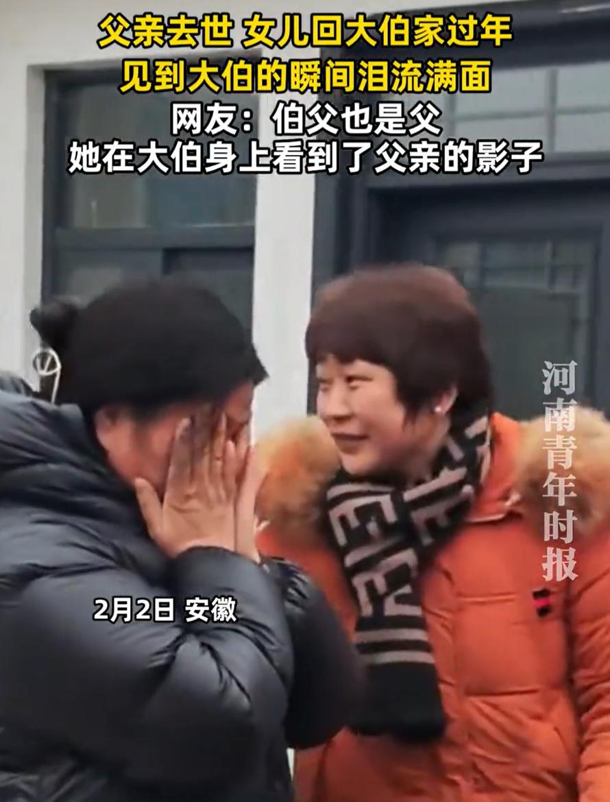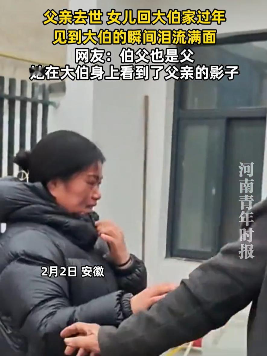 破防了!安徽,女子父亲不久前去世,过年没地方去,就被大伯叫到家里来过年,结果见到大伯的瞬间,直接哭成了泪人。网友:感同身受,伯父也是父,和父亲流着一样的血液! 今年的春节,对于女子来说并不好过,往年父亲还在,自己还有个盼头和归处,可父亲去世后,她也不知道该怎么办好,80岁的大伯打来了电话,喊她回家过年 这个“回家”,去的是父亲出生的地方,是老房子,是父亲的哥哥家。对她来说,踏进那个门槛需要勇气。那里的一砖一瓦,可能都叠着父亲的影子;空气里,或许还飘着往年团聚时的饭菜香。她一定是带着复杂的心情去的,有感激,有伤感,还有些许近乡情怯的惶然 然后她见到了大伯 就在见面的那一刻,所有的堤防瞬间溃败。她看着眼前这个与父亲血脉相连、面容或许有几分相似的老人,仿佛看见了父亲的另一种存在 她一下子哭了出来,哭得不能自已。那是一种毫无伪饰的情绪释放,是对父亲汹涌的思念,也是对这份收留的亲情最直接的回应。大伯或许没有说话,只是拍拍她的肩,这个简单的动作,胜过千言万语 这一幕被家人发到网上后,看哭了无数网友 有网友说:看到了大伯,仿佛看到了父亲,怎能不潸然泪下,从此刻起,大伯家就是你的娘家啊 其实对于不少家庭来说,伯父有时就承担着“父”的角色,尤其在弟弟离世后,那份对侄儿侄女天然的疼惜与责任,常常会自然而然地流露出来。这声“大伯”,喊的不仅仅是亲戚称谓,更是一份可以倚靠的亲情