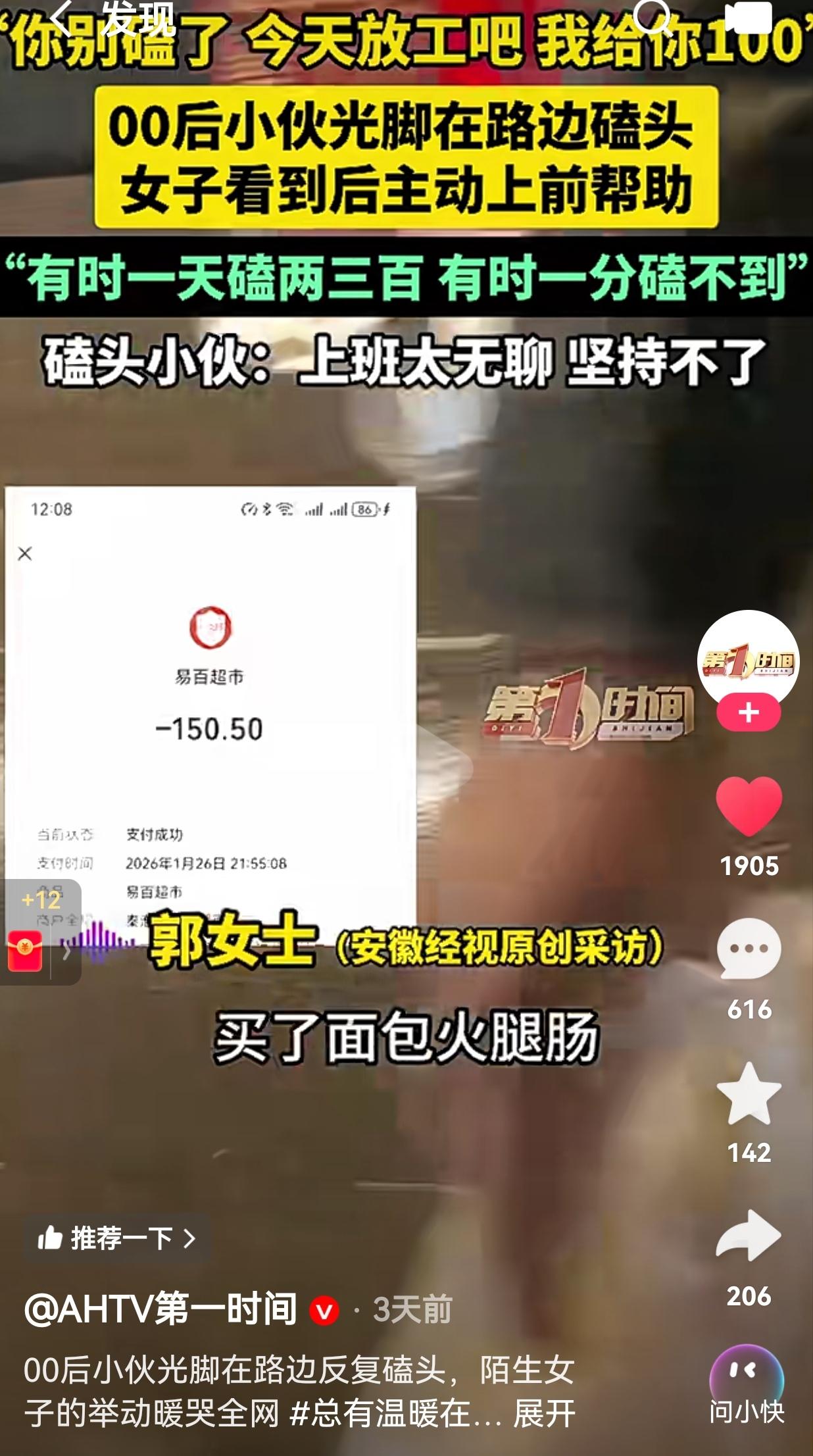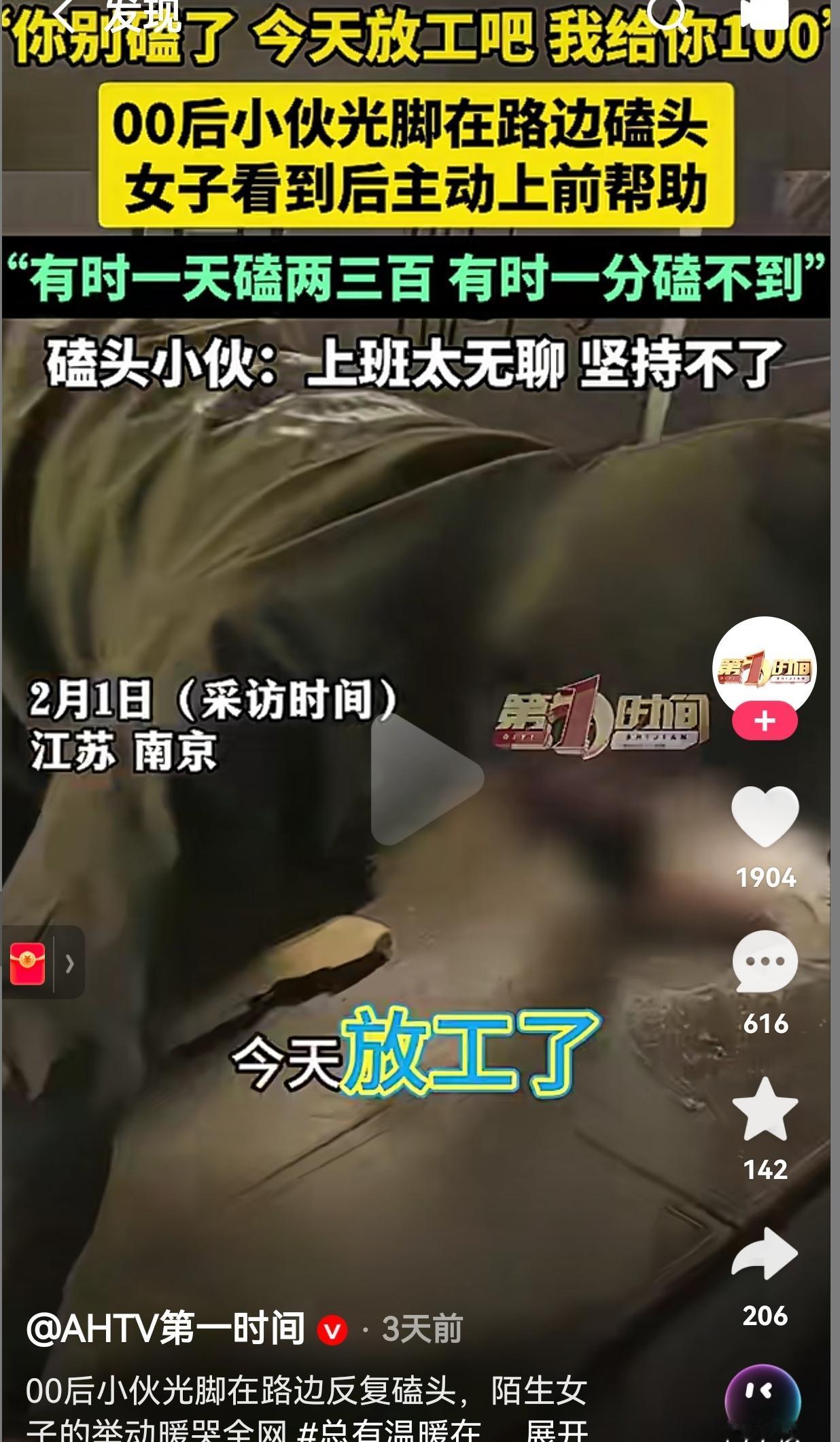 成年人的世界哪有容易二字?就算很难,也要坚持下去!2月1日南京,晚上九点多,郭女士路过一街头,看见一个00后小伙子光着脚,跪在冰冷的路边,一下又一下地向路人磕着头。 她实在看不下去了,蹲下来轻声说:“你别磕了,今天放工吧,我给你100。” 据了解,这个00后的小伙来自河南登封,他就是觉得上班太无聊,坚持不下去,才出来靠磕头讨生活。 郭女士看她可怜,想给他介绍一份工作,而小伙却说,之前也有人给他介绍过包吃包住的工作,可却坚持不住,因为上班不能玩手机,实在太闷了。 当被问及小伙磕头的收入时,小伙却说:“运气好的时候,一天能磕个两三百块。运气不好,就一分钱都没有。” 他说自己白天他不敢出来,怕被熟人看见,只有夜深人静的时候,才敢光着脚跪在路边。 而他的住处更是让人心寒,他晚上没地方住,就只能窝在商场里凑合一晚。 当时郭女士的身上没带现金,特意跑到附近的超市买了面包和火腿肠,顺便换了100块现金递给他。 她没有说教,没有指责,只是心疼地念叨:“那光着脚多冷啊”,然后认真地问他:“要不要我给你找个班上?包吃包住的那种。” 她没说“你应该去找份正经工作”,也没说“年轻人不能这么没骨气”。 她只是看到了一个大冬天光脚跪在地上的孩子,本能地想让他早点结束这份难堪。 不仅如此,她还拍了视频发到网上,帮这个小伙子寻找家人。没过多久,男孩的妈妈就联系上了她,在电话里哭得泣不成声,说明天就来南京接孩子。 此事传到了网上,有的网友说:“郭女士真的是菩萨心肠!如果换成我的话,我可能就路过了,她还特意跑超市换现金,又买吃的,还帮着找家人,太暖了!” 还有的网友说:“说实话我也觉得上班无聊,但至少能攒点钱啊,这小伙子太傻了,不过也挺心疼的,希望他妈妈来了能把他带回去好好过日子。” 要我说,这个世界上,从来没有容易二字。试问一下?如果不是为了生活,谁愿意出来工作呢? 希望小伙子早日想开一点,别再到处乞讨了!与其在这里没有尊严地活着,还不如老老实实地找个班上。别再说工作太无聊了,坚持不下来,你要知道,只有工作才能生活,没有工作,别说报答父母的养育之恩了,就连自己的衣食住行都成问题。 乞讨真的不是长久之计,更不是明智之举! 大家觉得呢?欢迎大家评论区讨论留言。