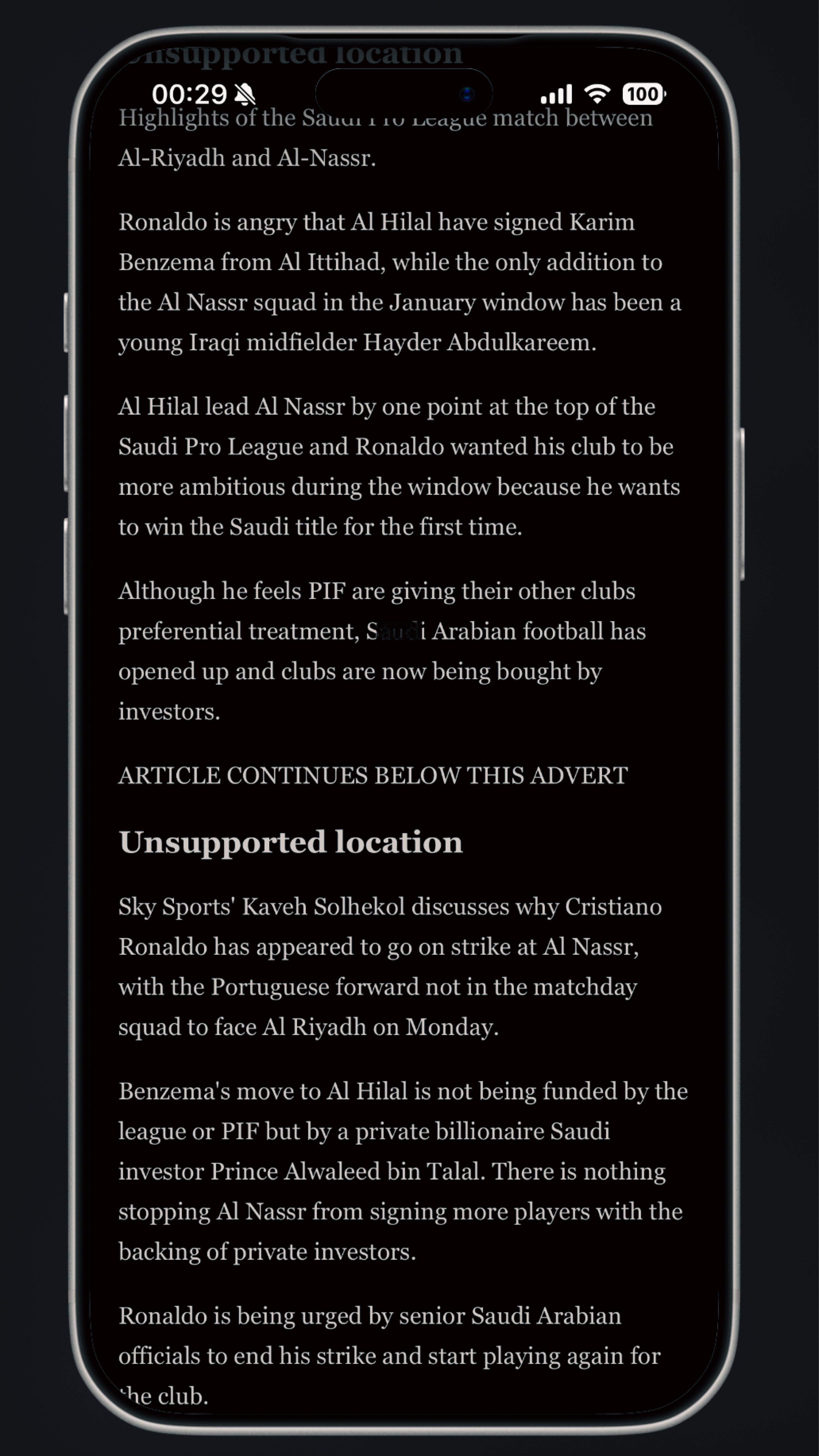 🔷 原文:由于对沙特阿拉伯利雅得胜利(Al Nassr)从沙特公共投资基金(Saudi Public Investment Fund,简称SPIF)获得的财政支持感到担忧,克里斯蒂亚诺·罗纳尔多正在考虑他在沙特阿拉伯的未来。SPIF旗下还拥有利雅得新月(Al Hilal)、吉达国民(Al Ahli)和吉达联合(Al Ittihad)三支球队。利雅得胜利目前在沙特职业联赛中排名第二,落后利雅得新月一分。克里斯蒂亚诺·罗纳尔多正在考虑他在沙特阿拉伯的未来,因为他担心利雅得胜利获得的财政支持与其他俱乐部相比存在差距。