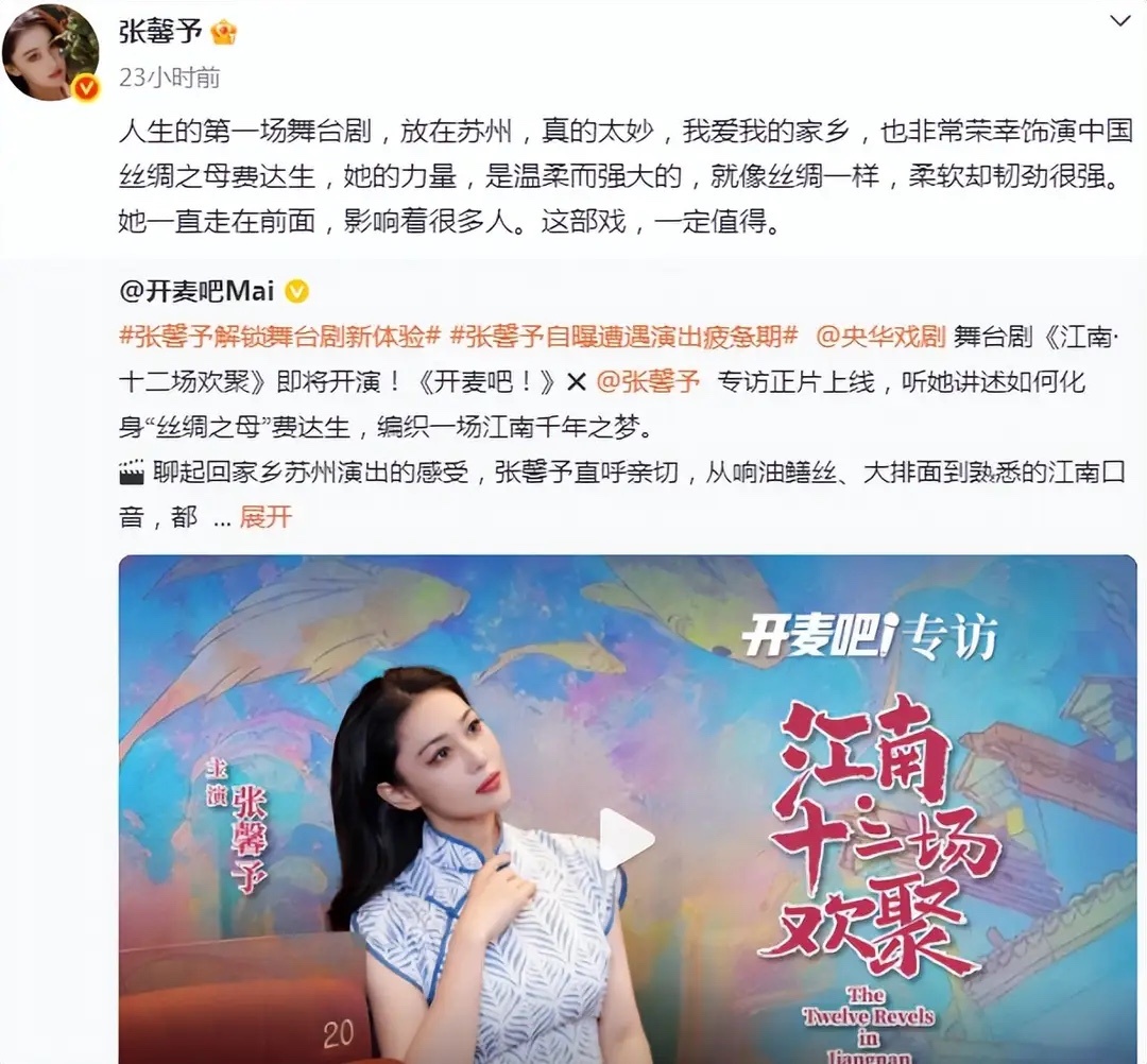 张馨予首演舞台剧,何捷公开发文支持,夸妻子美丽温婉自信好宠!