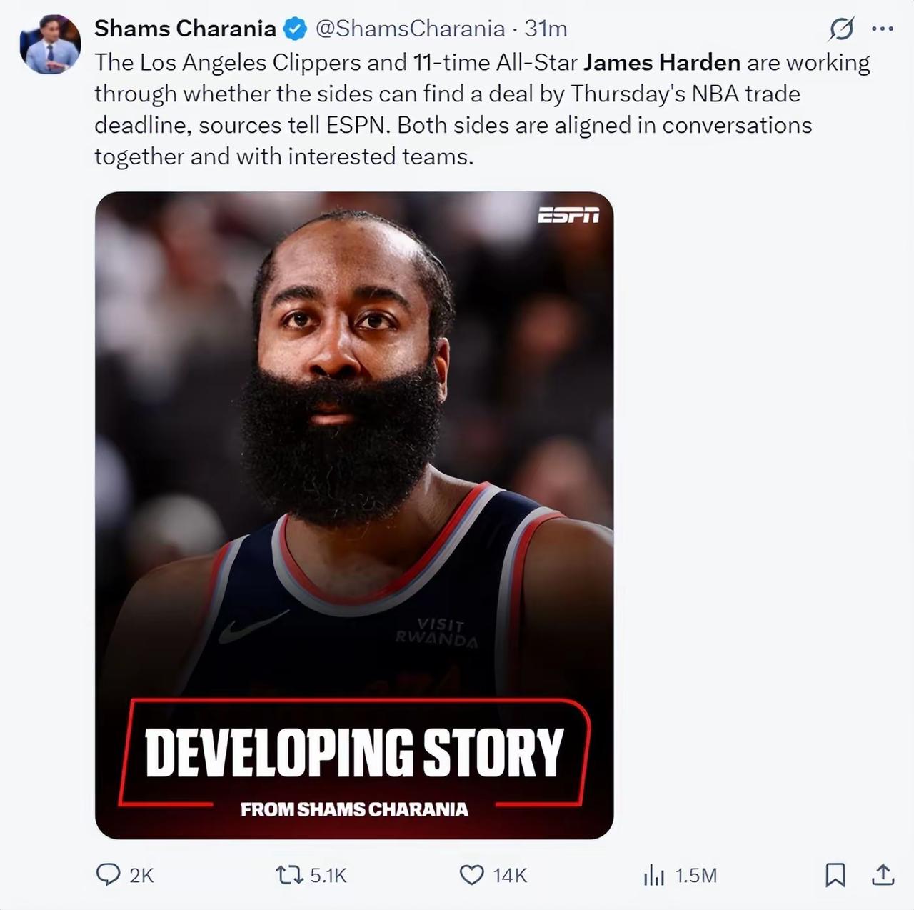 Shams:“骑士队与哈登的谈判非常顺利,骑士队向哈登承诺,他们的下个目标是字母