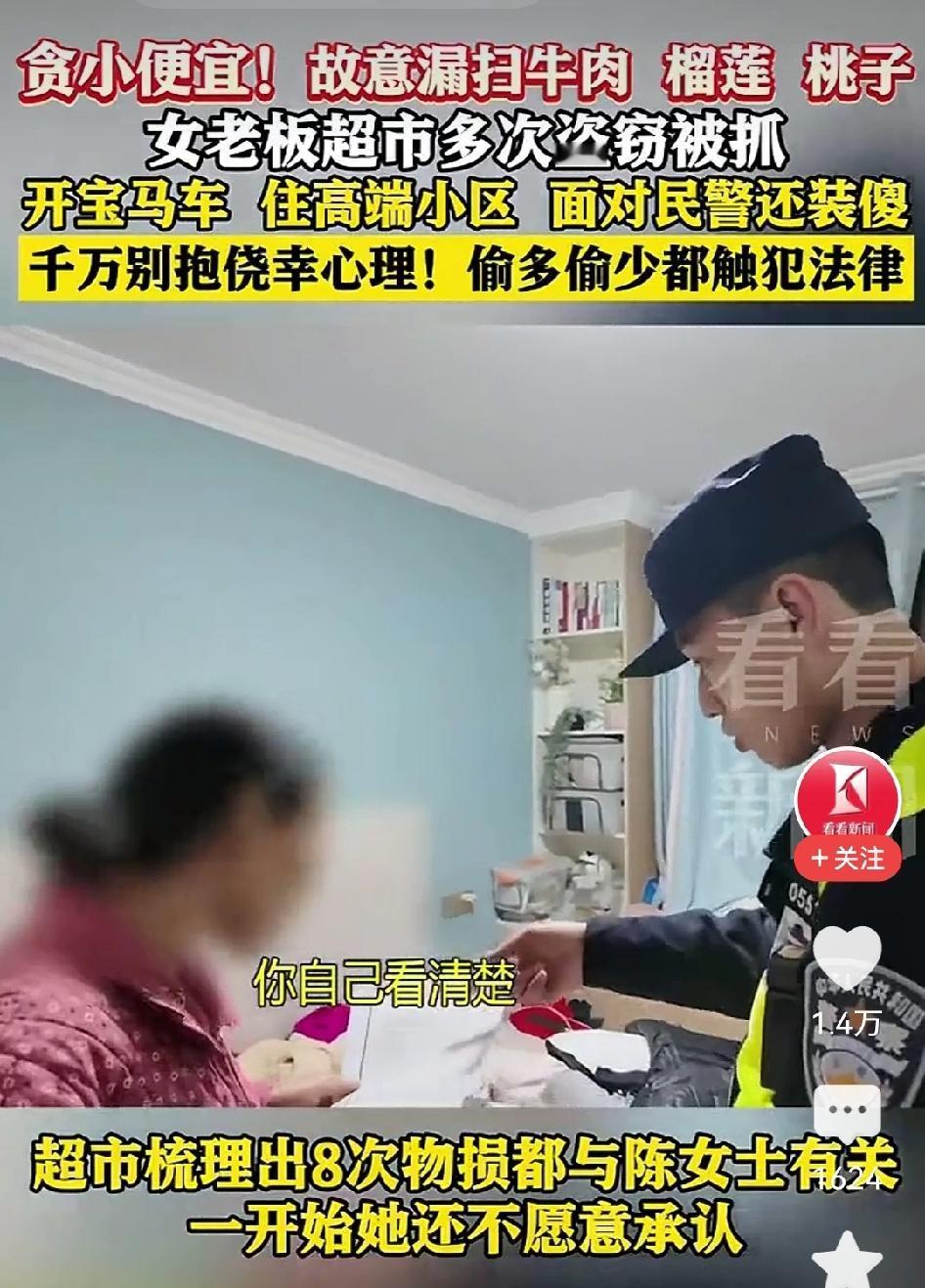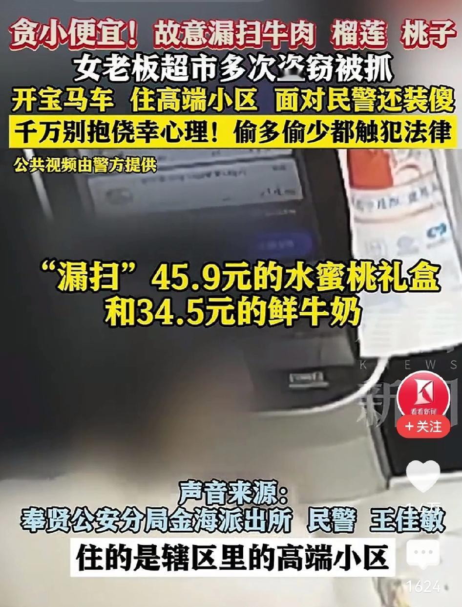 开宝马,住高端小区,的女老板,竟然干出超市偷窃的事儿。难道女老板的生意也是靠偷鸡摸狗攒下的吗? 可能跟人品有关,做老板也不一定就手脚干净,有时候,没钱的倒是穷大方。还看不上那些身外之物。 还有就是习惯问题,女老板可能不那样做心里不舒服,就爱沾点小便宜,久而久之就习惯了,也不管金额大小。 这种人就应该重罚,说不定就长记性了!