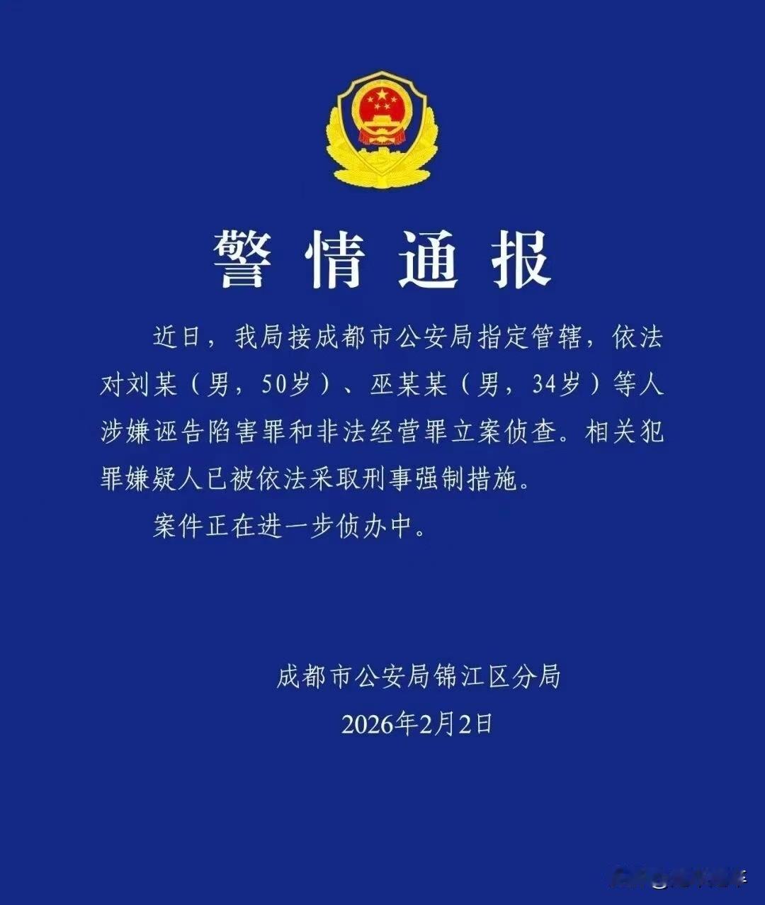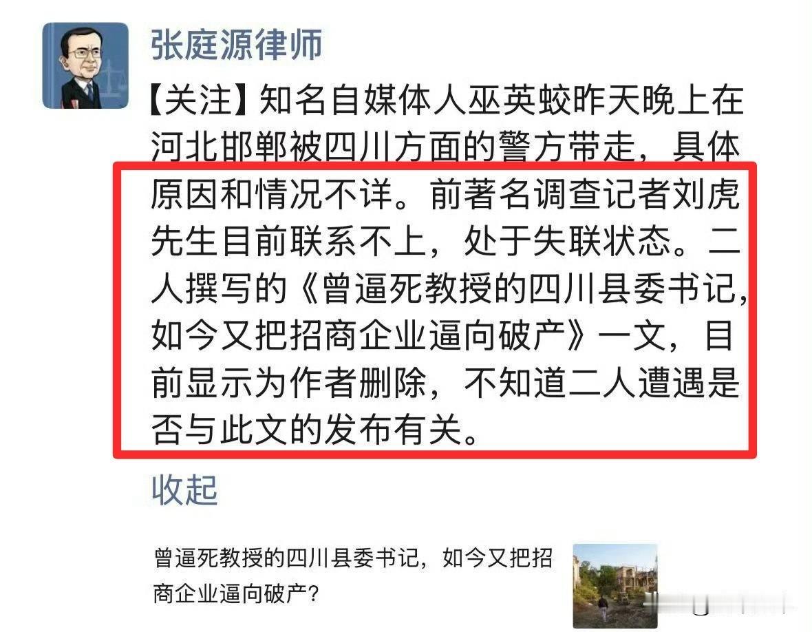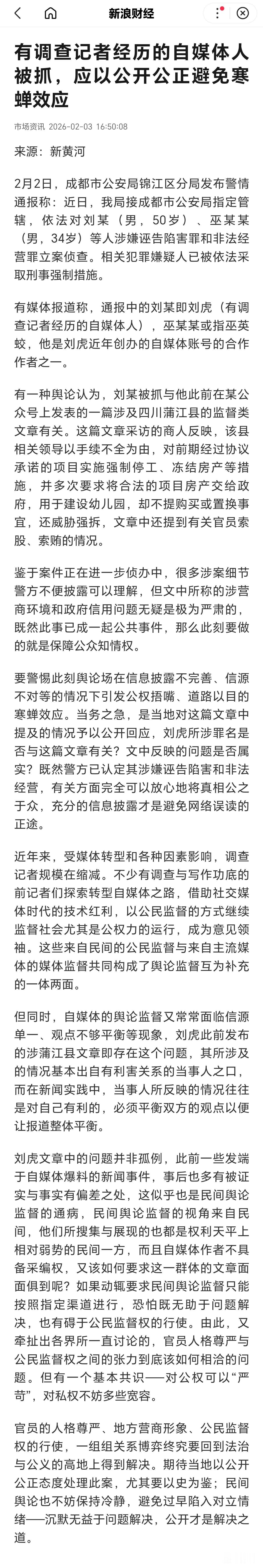 前记者刘虎被抓,引发了公权力是否借刑事手段压制批评挤压,网民监督空间的争论? 前调查记者刘虎与其合作者巫英蛟因涉嫌诬告陷害罪和非法经营罪被成都警方采取刑事强制措施。2月2日,成都市公安局锦江区分局通报对刘某(50岁)、巫某某(34岁)等人立案侦查,二人被采取刑事强制措施。二人失联前,曾于1月29日发布文章,指控四川蒲江县委书记在任期间涉“强拆致教授自杀”“逼迫企业破产”等问题,并提及官员索贿、违规冻结资产等细节。 目前警方以“案件侦办中”为由未公布具体证据,但刘虎的文章涉及的营商环境和官员索贿问题具公共属性,应早日公开公正避免寒蝉效应。首先要知道诬告陷害罪需满足“捏造事实并向国家机关告发”,但刘虎文章发布于自媒体平台,是否构成“告发”这就是一个疑问🤔其次非法经营罪,警方指控二人“收费帮商人发布举报内容”,但自媒体收稿费、广告费是否等同“非法经营”这更是引起了争议?若刘虎的文章存在捏造或收费维权属实,司法介入具正当性。 刘虎曾因13年举报副部级官员被羁押346天,最终的结果是不起诉。此事件也入选[中国十大传媒法事例],此次再因监督文章被抓,质疑是否是“历史重演”。群众担忧公权力借刑事手段压制批评,挤压公民监督空间。个人认为自媒体缺乏传统媒体采编权,若苛求其报道“面面俱到”,可能变相压制民间发声。只要非恶意捏造事实且未涉及到公共利益,应允许存在瑕疵的监督。若存在着偏差太大的问题,可通过民事侵权而非刑事追责解决。目前案件仍在侦查阶段,公众期待真相在法治框架下早日厘清。