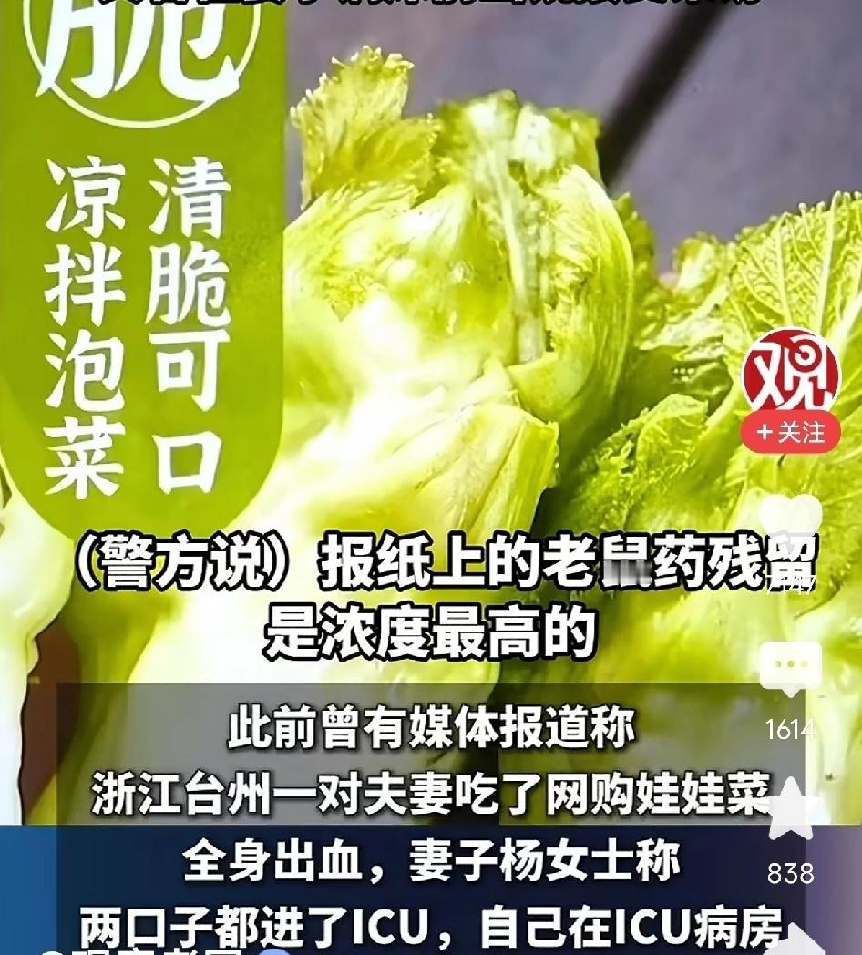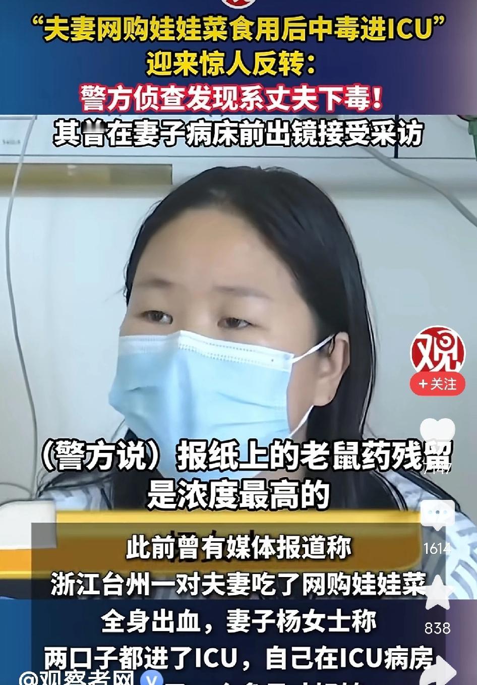 “网购娃娃菜食用后中毒”系夫妻合谋、意图骗赔! 乖乖,这剧情反转也太快了! 我一小时之前看到时说网购商家旧报纸上沾了鼠药造成的,半小时前又说是丈夫下毒(意在杀妻骗保),一小时后的现在又说是夫妻合谋的! 不知道再过一会会不会再有新的反转呢? 不得不说,这人是真狠,为了钱自己给下毒! 同一批菜如果卖了上百单都没事,就他们两个中毒了,这一看就存在问题! 娃娃菜中毒 种菜中毒