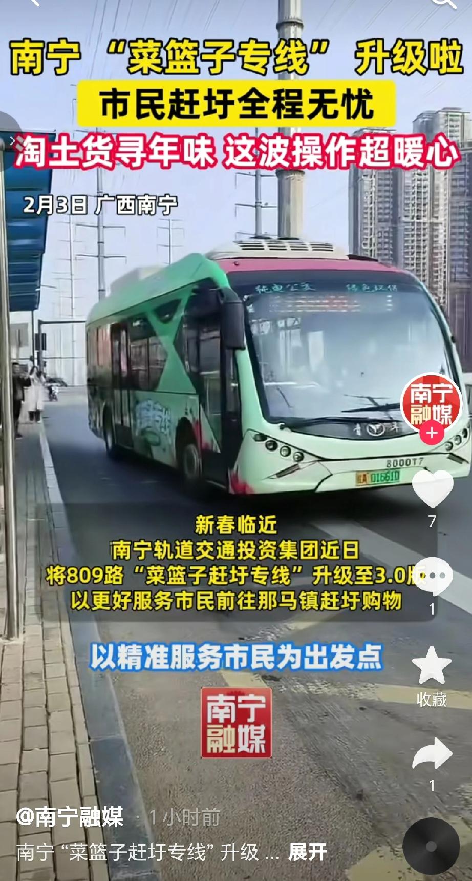 2026年2月3日起,南宁809路“菜篮子赶圩专线”升级至3.0版,全方位方便市民前往那马圩采购年货,客流高峰时段会灵活增加发车班次,保障“客满即走”;沿线重点站台新增2026年那马圩日表,清晰标注圩日日期、加装承重挂钩方便悬挂采购品,配备便民药箱、雨衣、免费饮用水等物品;还张贴了剪纸窗花、新春对联,营造出浓厚的节日氛围。福建园站、平良立交站等地铁接驳点设“赶圩爱心休息区”,提供打包绳、小拖车等便民设施及现金兑零点等应急服务;地铁站还开了“爱心通道”并增设公交指引标识,实现“地铁+公交”无缝衔接。(来源于@南宁融媒)
