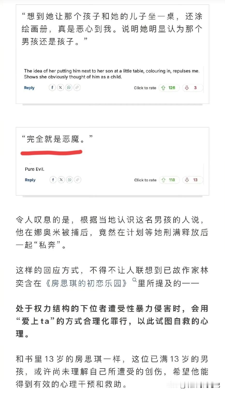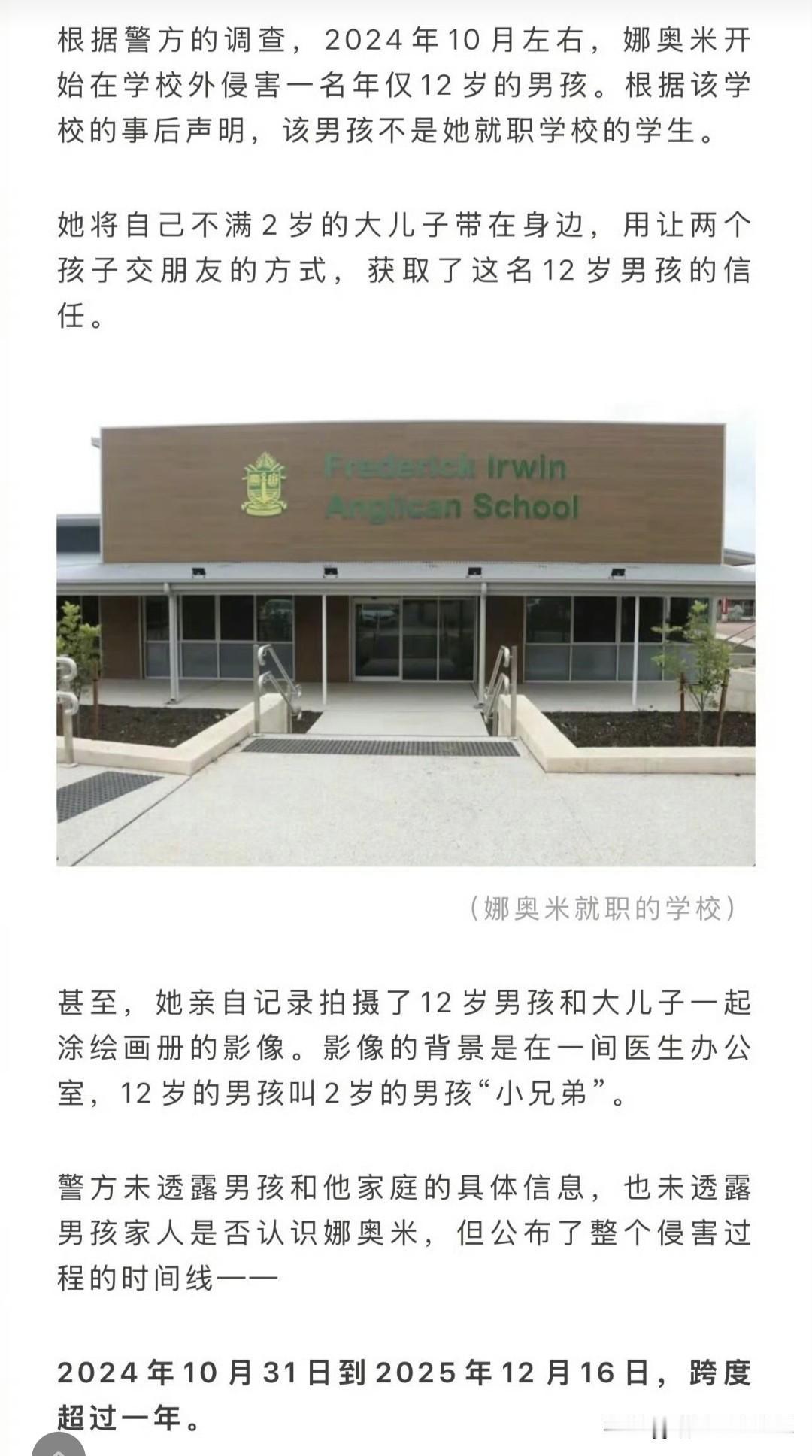 女教师,以“单独指导”做包装,把十二岁的男孩拖进琴房与车厢,反复施暴;她甚至拉来亲生儿子当烟雾弹,好让“猎物”卸下戒心。 “老师”两个字,本该是孩子的安全词,如今却成了她罪行的隐形斗篷。三十三岁、已婚、二胎尚未落地,她一边把孕照晒上网收割点赞,一边把十二岁的学生拉进长期侵害的黑洞,最终让那名男孩成了新生儿的生物学父亲。 直到法庭上那声平得像水面的“我承认”落地,她的丈夫才像被人当头棒喝:那些他亲手拍下的温馨孕照,竟是恶魔的“战利相册”。 男孩在社交平台留言:“等她出狱,我们就远走高飞。”这不是童话爱情,而是猎物对猎手患上了“斯德哥尔摩症”;是成年人的绝对权力,把孩子的意志碾碎后重新捏成的畸形依恋。 我们总教孩子“要听老师的话”,却忘了告诉他:当那句“替我保密”从老师口中飘出,第一时间要尖叫“救命”。 孩子不会一夜长大,但罪犯会一夜隐身。权力一旦失去制衡,任何身份都可能沦为加害的挡箭牌。与其只教孩子“听话”,不如让他学会“分辨”与“拒绝”! 「图源网络」