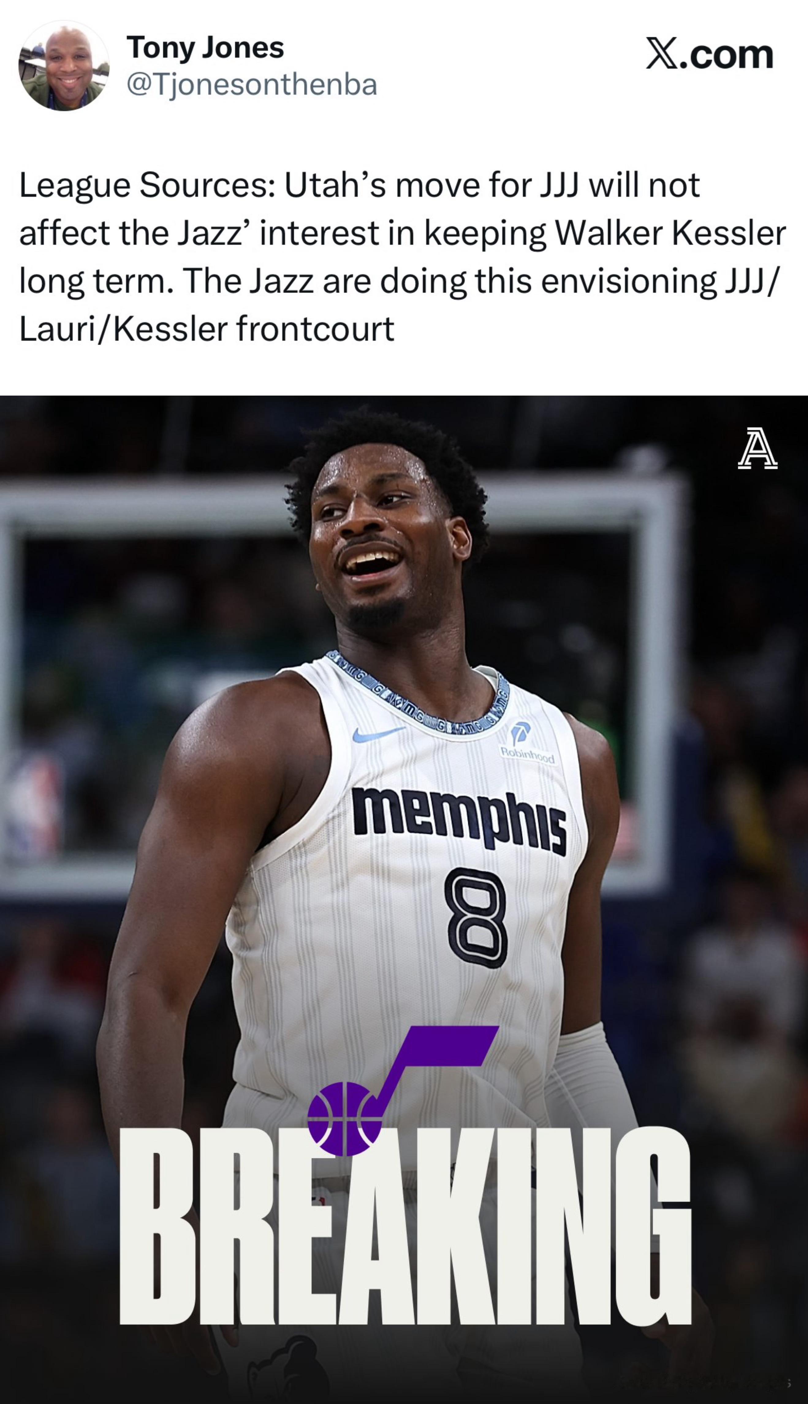 爵士记者托尼:犹他爵士队引进JJJ的交易不会影响他们长期留住沃克·凯斯勒的意愿。爵士队此举是设想JJJ/劳里/凯斯勒组成的前场阵容。