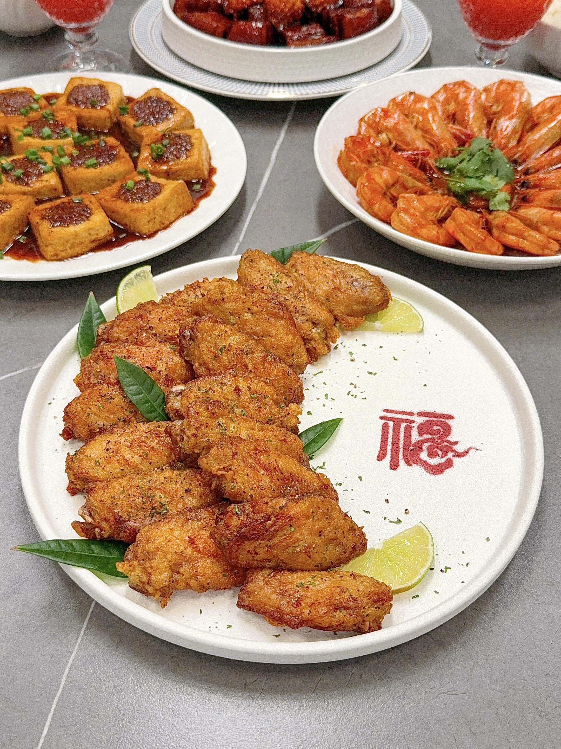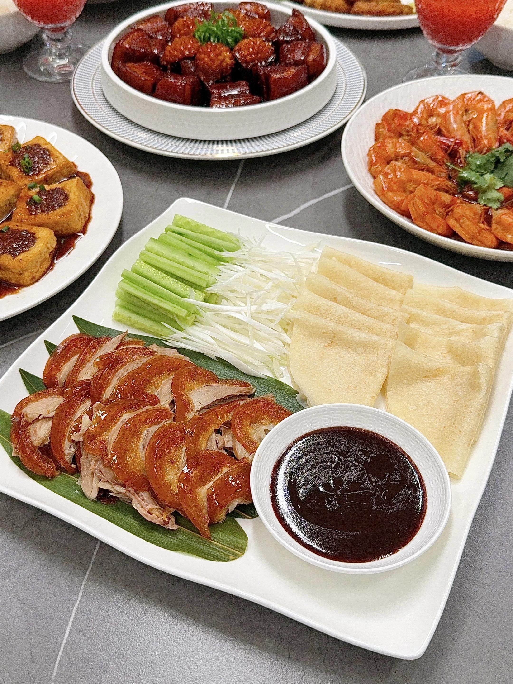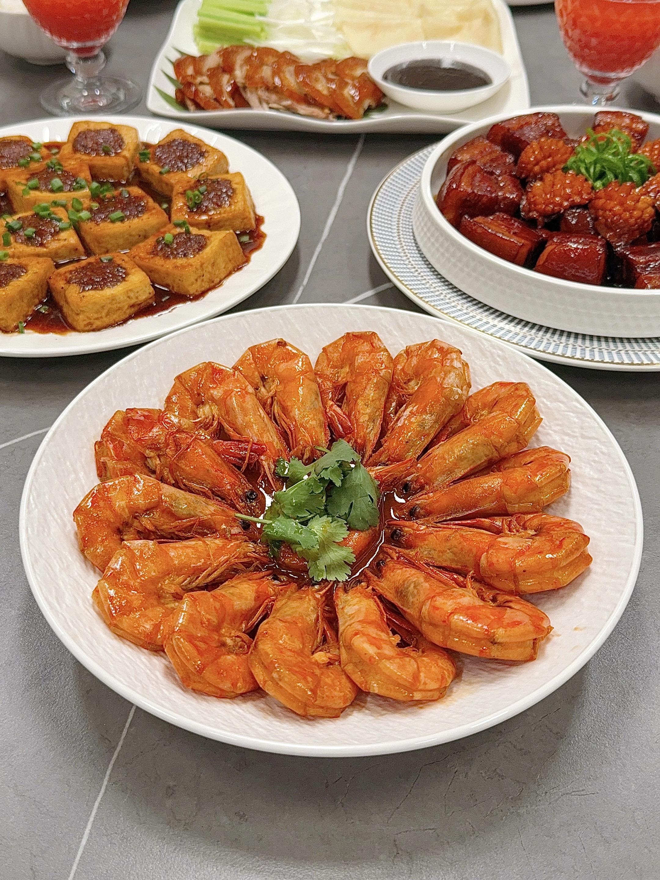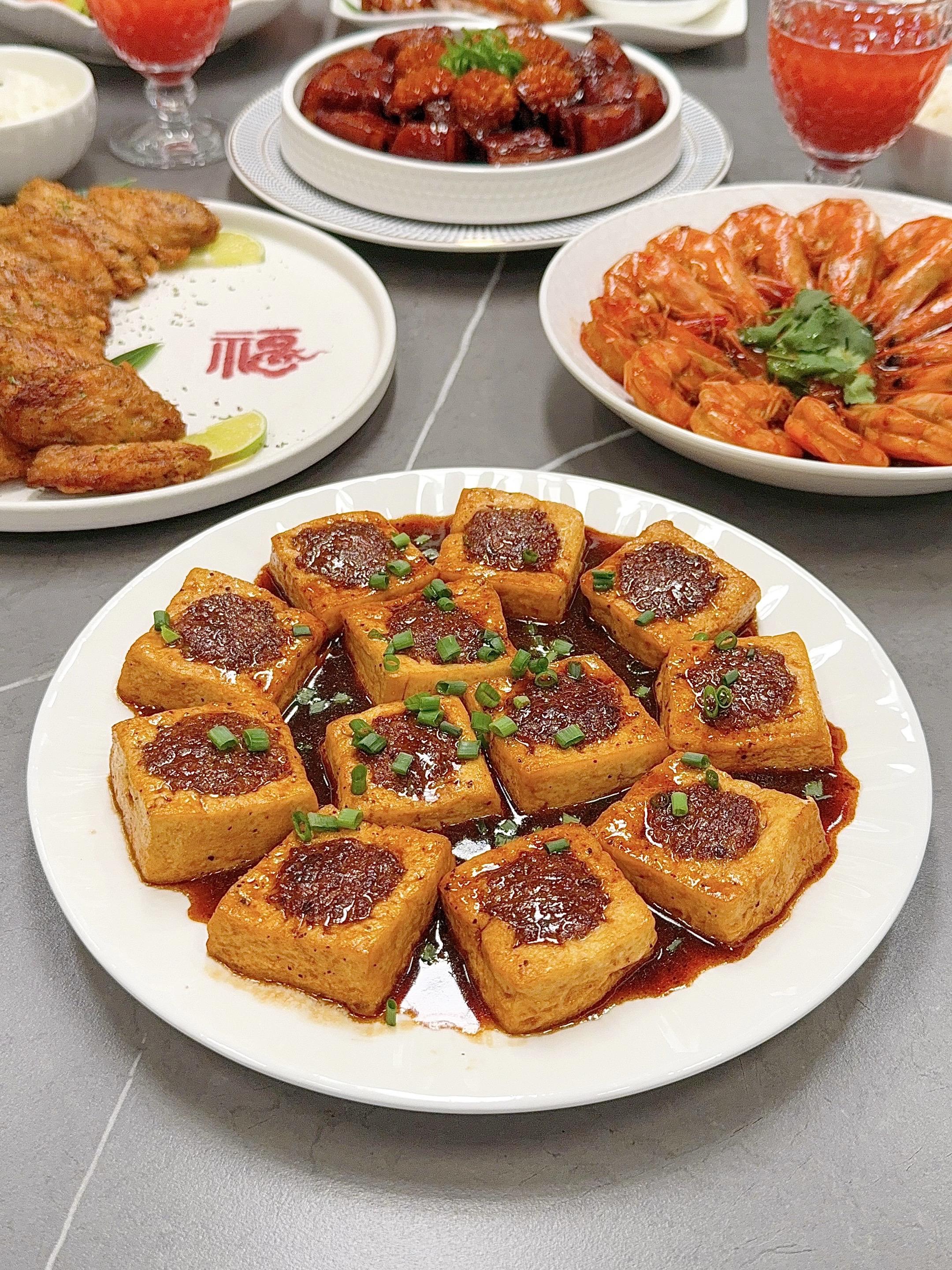 分享年夜饭灵感。又到了年末聚餐的时候~ 说真的,家宴的精髓不在于多复杂,而在于每道菜都带着“用心”的温度。比如那锅咕嘟冒泡的红烧肉,比如煎得金黄的酿豆腐…食物最诚实,你花了多少心思,它就会回馈多少味道。 🧧新年家宴菜单分享: ❶【鲍鱼红烧肉】 ❷【椒盐鸡翅】 ❸【北京烤鸭】 ❹【油焖大虾】 ❺【客家酿豆腐】 ❻【凉拌素什锦】 ❼【金银发糕】 🍒水果:车厘子