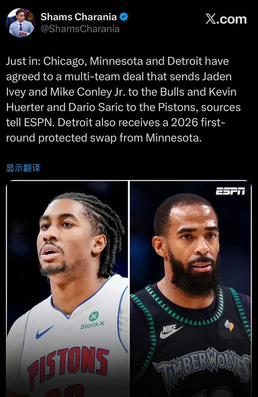 森林狼瞄准字母哥,与公牛、活塞3方大交易腾出超空间! 具体交易为:活塞得到赫尔特、萨里奇、2026年首轮互换权(森林狼); 公牛得到:杰登-艾维、迈克-康利; 森林狼: 避奢侈税、腾空间阵容名额追逐字母哥。 活塞是觉得现阵容够强了?艾维就放弃了有点可惜啊!