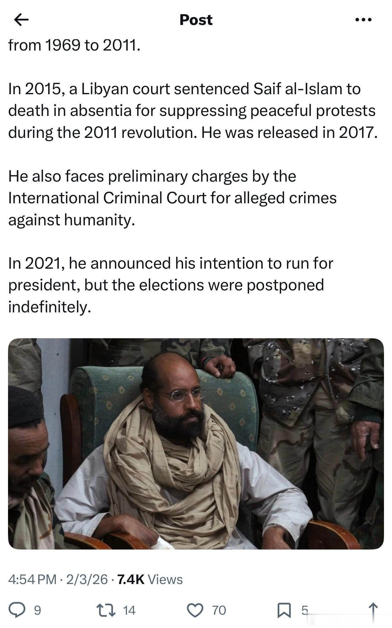 2015年,利比亚一家法院缺席判处赛义夫·伊斯兰死刑,罪名是在2011年革命期间镇压和平抗议活动。他于2017年获释。