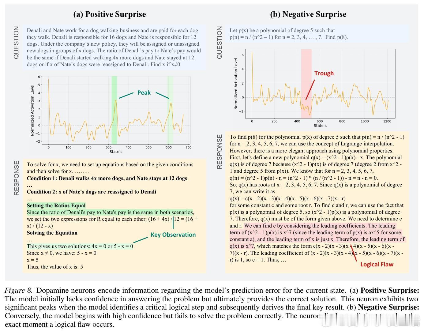 4. 多巴胺神经元:捕捉意外的惊喜与失落当模型的实际表现与内部预期发生偏离时,多巴胺神经元就会激活。当模型原本没信心但突然找到解题关键时,这些神经元会剧烈放电(正向惊喜);而当模型信心满满却在逻辑上踩坑时,其活跃度会跌至谷底(负向惊喜)。这种机制让模型在推理的每一步都能感知进步或挫败。