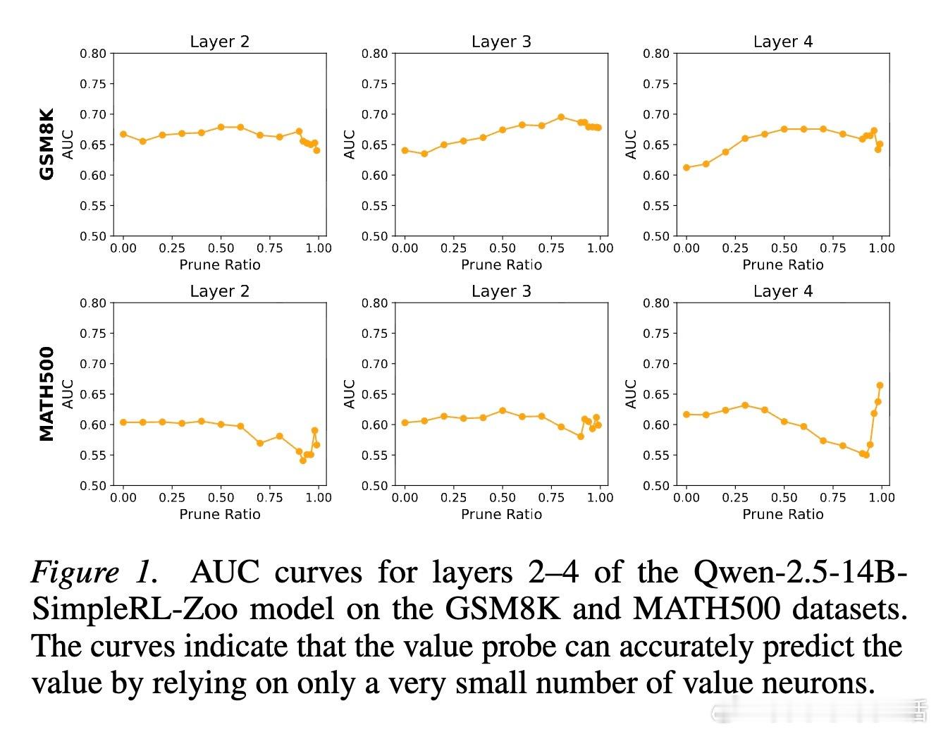 2. 价值神经元:模型心中的胜算研究者通过训练价值探针发现,LLM 内部存在一类专门代表价值预期的神经元。有趣的是,这些神经元极其稀疏。在成千上万个神经元中,只需提取不到 1% 的关键神经元,就能准确预测模型最终是否能解题成功。这种稀疏性说明,智能的本质往往掌握在极少数关键节点手中。