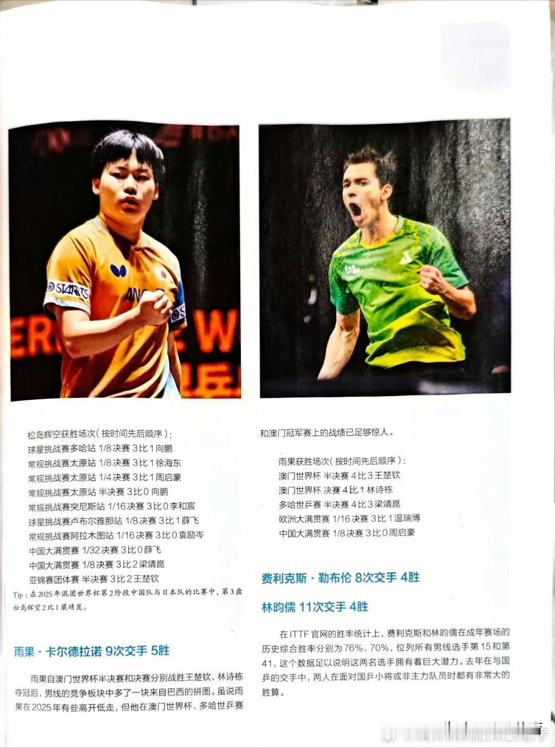 国乒主要对手速览(《乒乓世界》2月刊版) 男线:日乒双雄领跑,欧洲/美洲紧随 - 张本智和(日本):交手20次,10胜;交手最多、胜率50%,近台快攻+搏杀型打法,大赛冲击力拉满 - 松岛辉空(日本):交手17次,10胜;曾6连胜国乒,左手线路刁钻,正手穿透力强 - 雨果(巴西):交手9次,5胜;中远台相持顶尖,关键分硬实力突出 - 菲利克斯·勒布伦(法国):交手8次,4胜;直板创新打法,节奏变化难预判 - 林昀儒(中国台北):交手11次,4胜;控制+衔接细腻,擅长打乱国乒节奏 女线:削球成最大威胁,亚洲军团主导 - 桥本帆乃香(日本):交手14次,11胜;削转与反攻结合,近期对国乒胜率最高 - 朱雨玲:交手12次,6胜 - 张本美和/伊藤美诚/长崎美柚/大藤沙月(日本):前三板犀利、速度快,亚洲核心挑战群 为啥没排莫雷加德(小莫)?