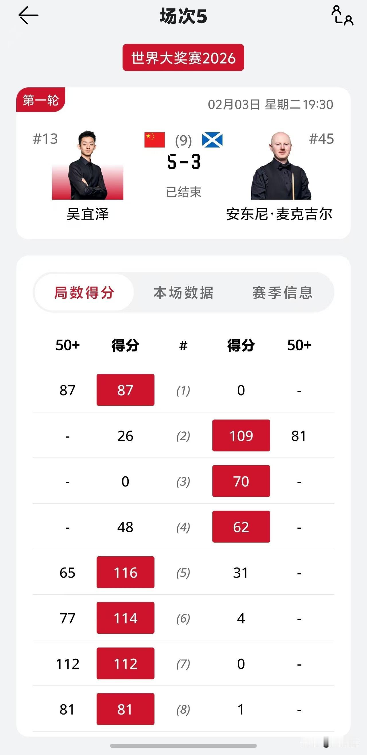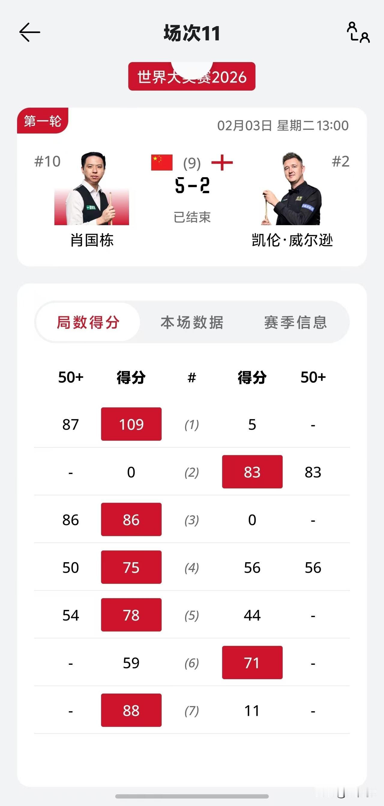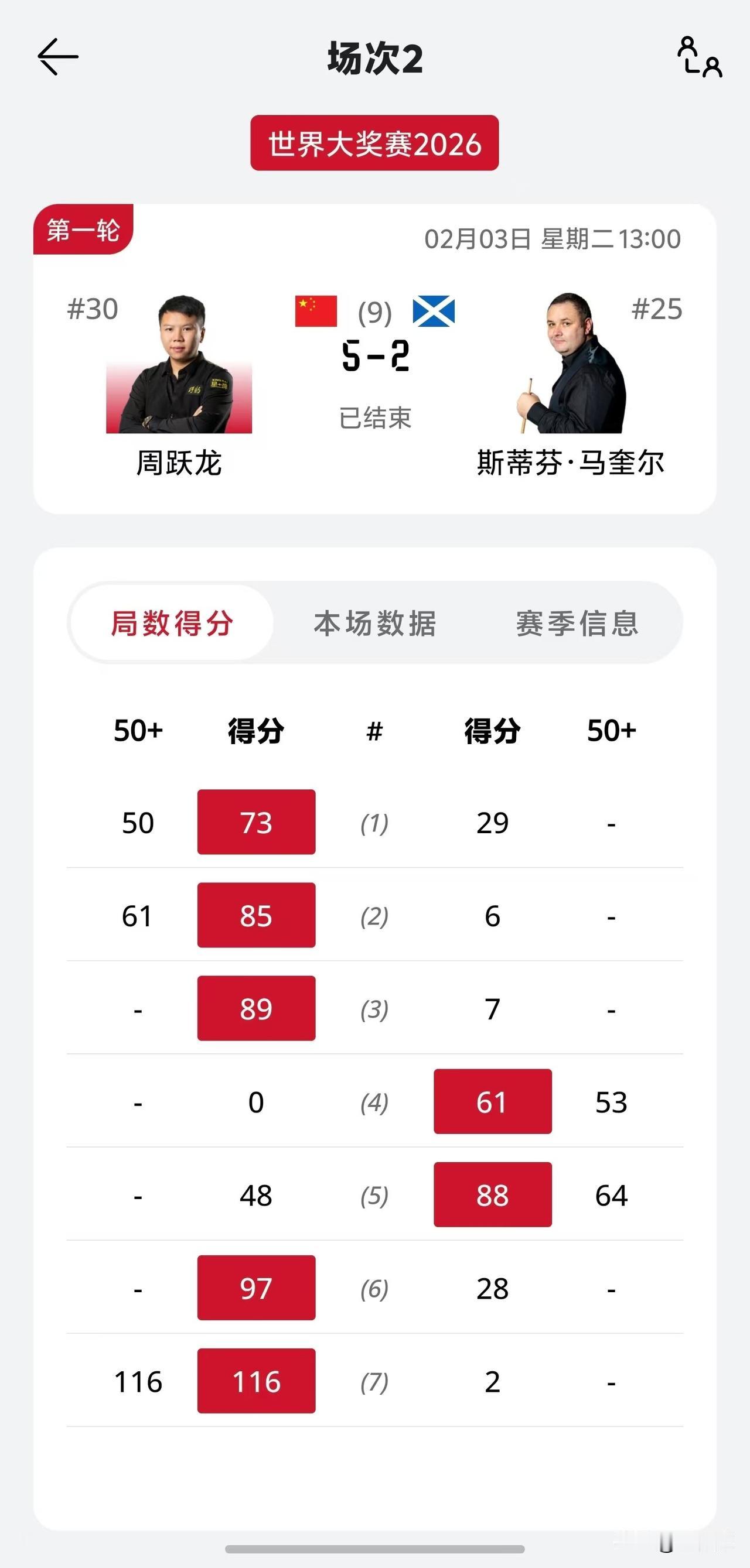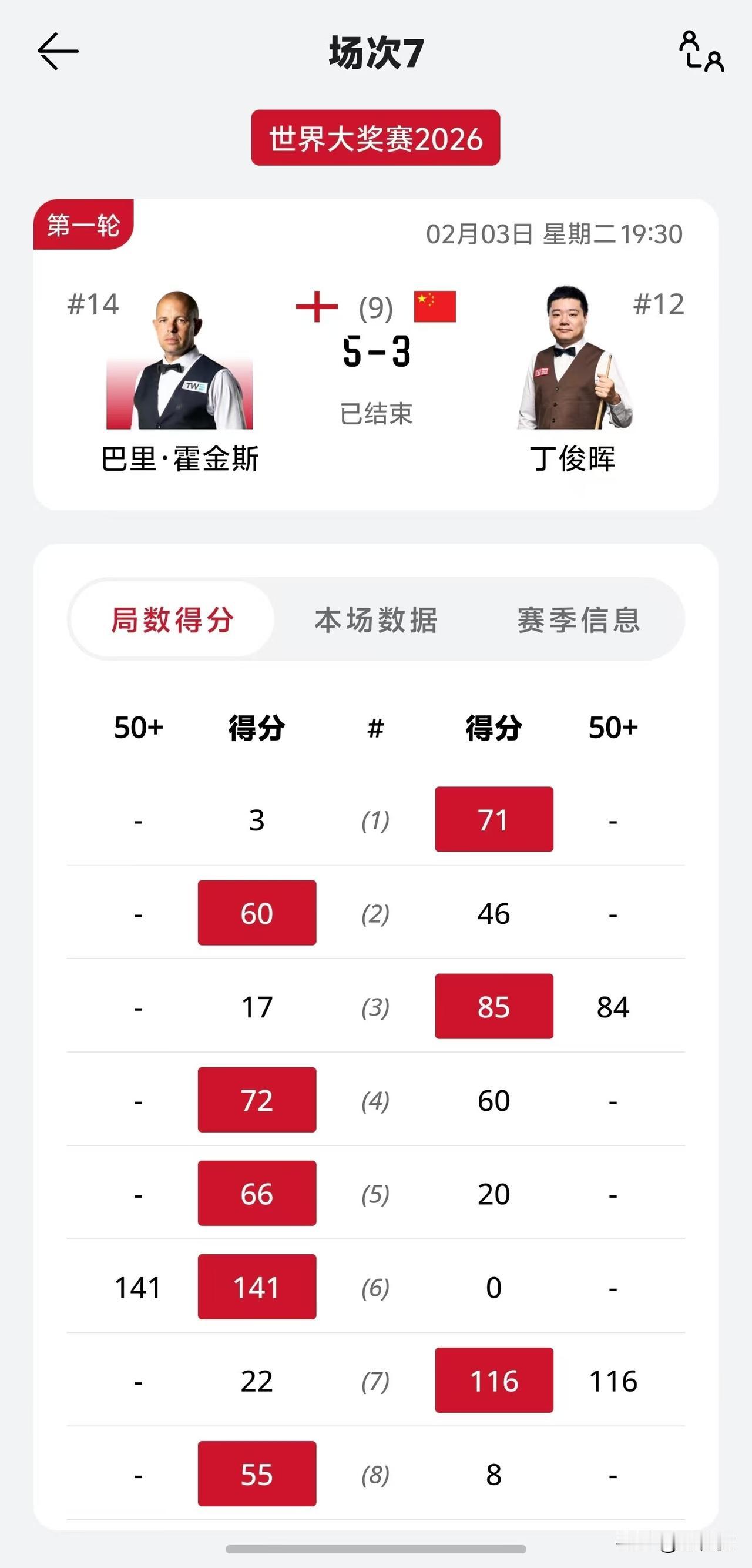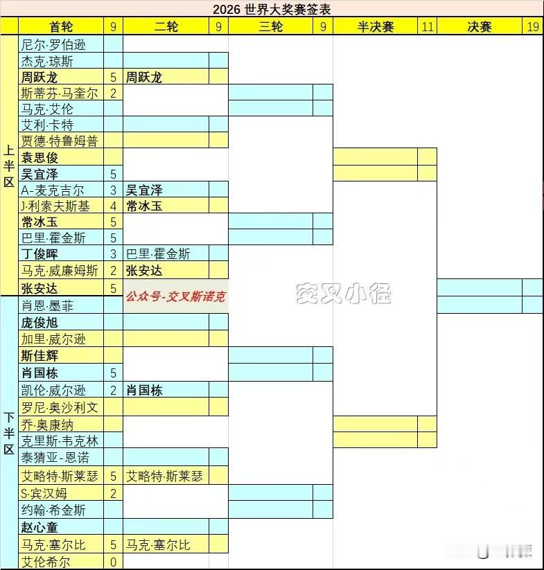 世界大奖赛2026|第一天比赛,中国军团大爆发,6人出战仅丁俊晖憾负霍金斯,无缘16强 北京时间时间2月3日13:00,斯诺克世界大奖赛第一天的比赛开打。第一天的比赛,中国军团有丁俊晖、肖国栋、张安达、周跃龙、吴宜泽、常冰玉6人出战。结果仅丁俊晖 3-5负于霍金斯,无缘16强。其余5人顺利晋级。 4日有赵心童、袁思俊、庞俊旭、斯佳辉4人出战。 世界大奖赛自2015年创办以来已经在赛历中度过了11年。这期间赛事经历了从邀请赛到排名,再从首轮落败球员无积分到只要参赛便可获积分的变化。比赛地点也经历了六次变换。单赛季32强入围比赛。到今年的第12届比赛,总计有22名中国球员入围该项赛事,参赛人数最少的一年的2021年的3人,最多是今年的10人(其中常冰玉首次入围)。中国球员参赛次数的前三为:丁俊晖11次、肖国栋9次,周跃龙6次,颜丙涛6次。 斯诺克16强 斯诺克年度大奖 斯诺克大奖赛 赵心童