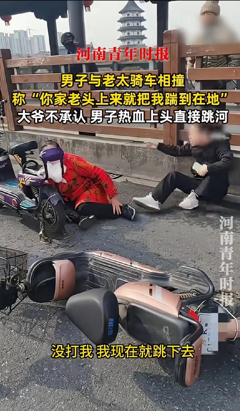 近日江苏扬州,一26岁男子骑车途中与一名老太太相撞,老太太家的老头赶到现场后,上来就踹了男子一脚,气得男子直接跳河了! 男子说老头上来就踹了他一脚,把他踹倒在地,还不承认!把监控调出来,没有打我,我现在就从桥上跳下去!说完,男子爬起身来就从桥上跳了下去,男子被气得热血上头,用跳河来证明自己了!