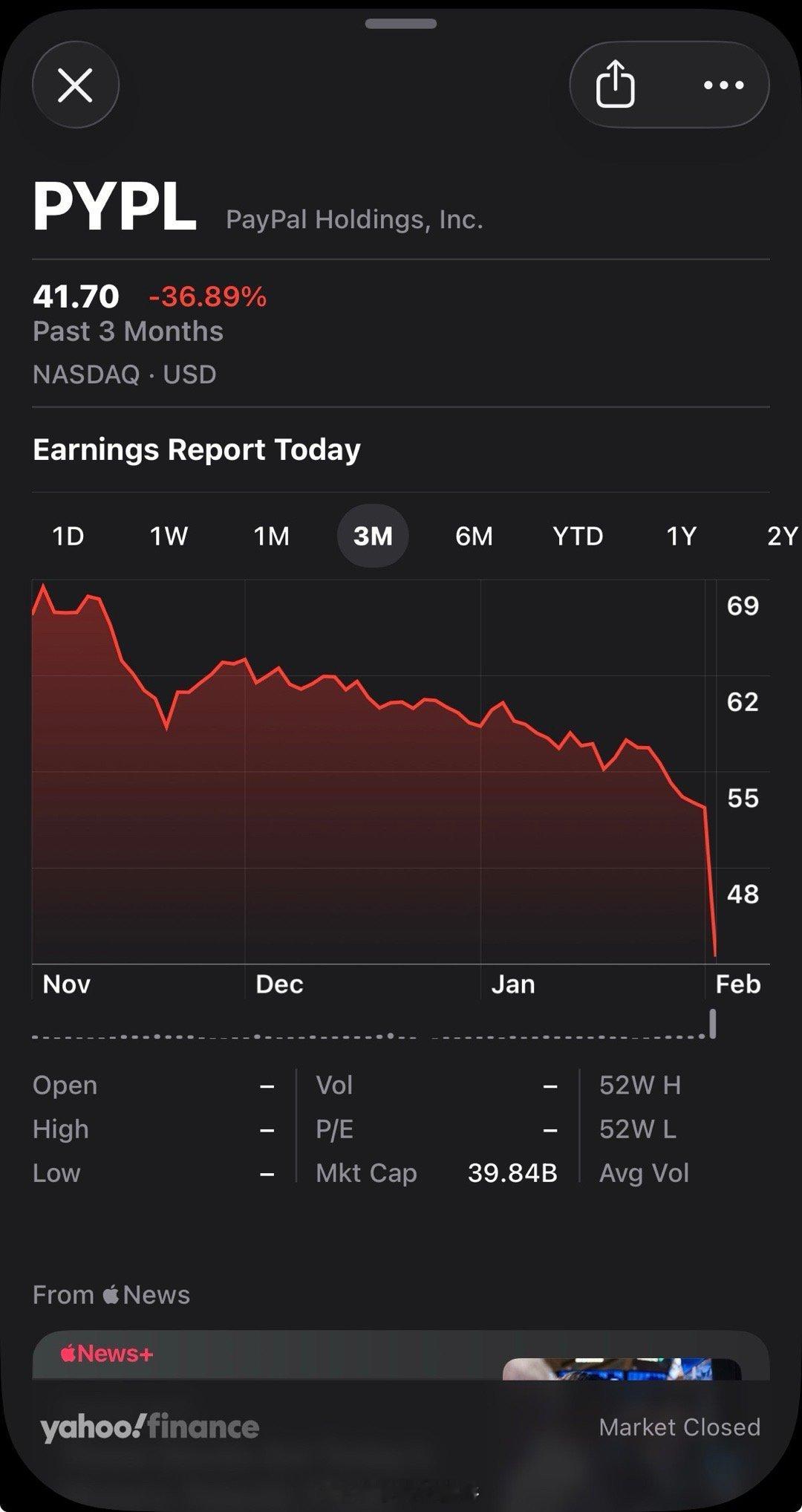 PayPal真惨。业绩低于预期,宣布更换CEO,找了前惠普CEO接替。今天下跌20%,过去五年崩了84.5%。
