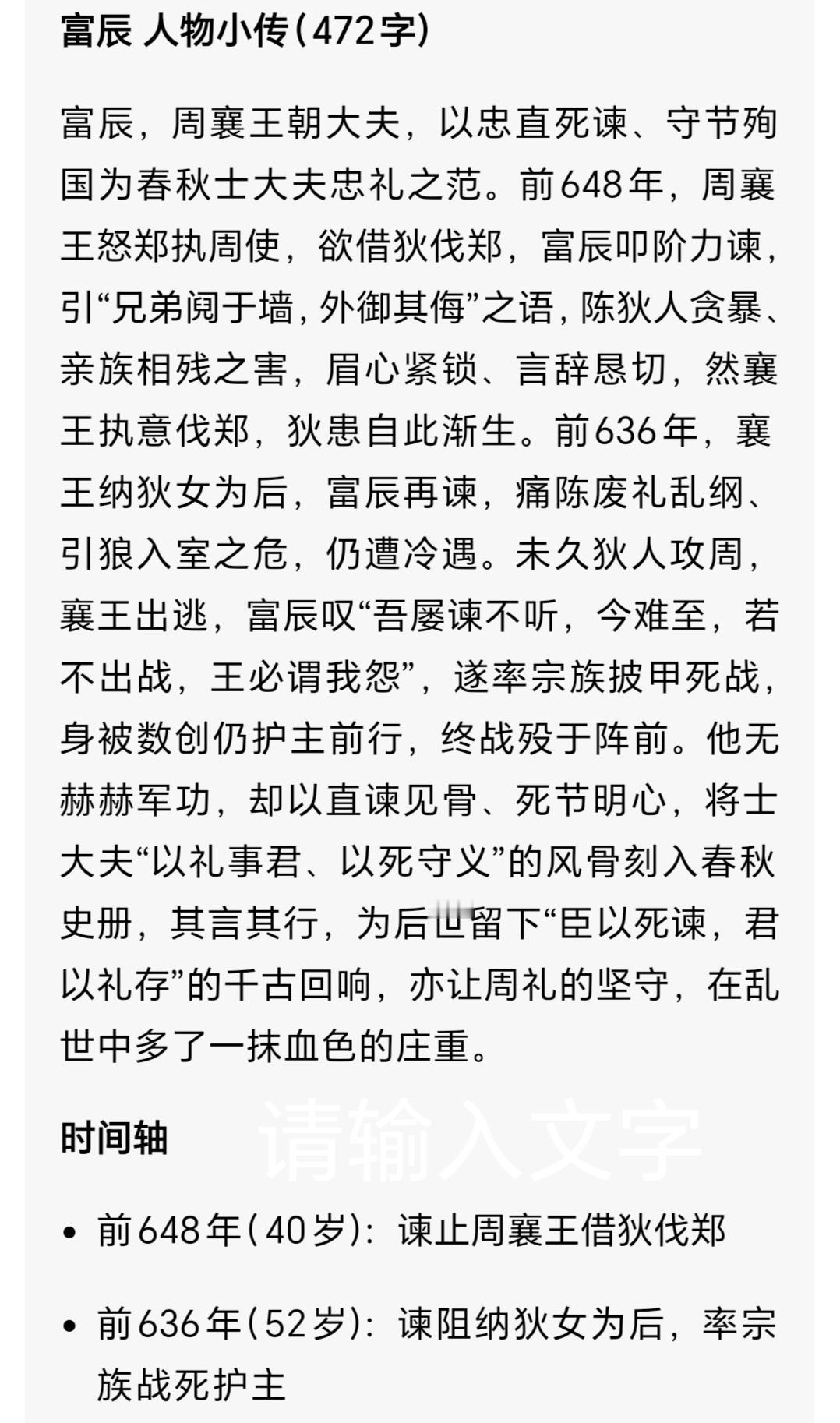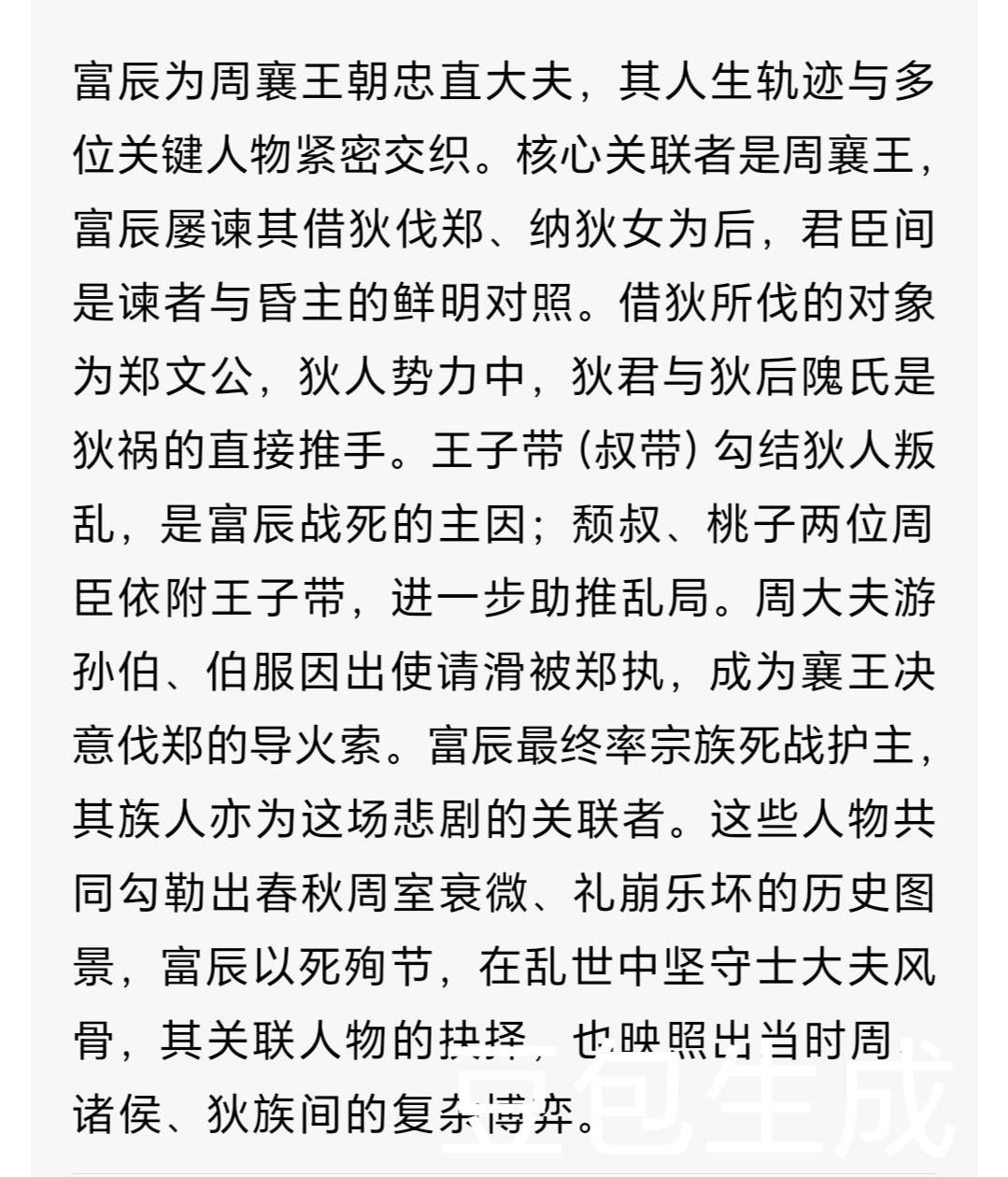 周臣富辰三谏襄王 以身殉国引争议 读懂春秋忠义坚守 世人常言春秋礼崩乐坏无义士,可周襄王的大夫富辰,却用三谏一死,在诸侯争霸的乱世里,刻下了最倔强的忠义印记。狄人(dí rén)的铁蹄踏碎洛邑(luò yì)宫墙,白发苍苍的他身着朝服,手持佩剑冲入敌阵,最终力战而亡。这份以死明志的选择,至今仍让人动容,也引发无尽讨论:这是愚忠,还是刻在骨子里的臣子大义? 富辰所处的春秋初期,周王室早已不复西周的鼎盛,天子权威日渐衰微,诸侯表面尊王,实则各怀争霸心思,同姓宗亲间也常因利益反目。周襄王在位时,王室能依靠的,唯有晋、郑等少数同姓诸侯国的支撑,而富辰作为王室老臣,始终将“亲亲尊尊”的周礼奉为圭臬,这也成了他数次犯颜直谏的初心。 一谏伐郑:犯颜直言,坚守宗亲之道 公元前639年,郑国因滑国叛郑附卫,出兵攻打滑国,周襄王派使者前去调停,不料使者竟被郑国拘禁。消息传回洛邑,襄王怒不可遏,当即想要借狄人的兵力讨伐郑国。 朝堂之上,满朝文武噤若寒蝉,唯有富辰挺身而出。他拱手躬身,额头的汗珠顺着皱纹滑落,却目光坚定,引用《诗经·棠棣》中“兄弟阋(xì)于墙,外御其侮”的诗句直言劝谏。他深知,周王东迁时全靠郑、晋两国扶持,子颓(zǐ tuí)之乱也是郑国出兵平定,郑国虽是同姓宗亲中的强势者,却仍是王室的依靠,因小怨弃亲借外邦之力,无异于引狼入室。“弃亲即翟(dí,通‘狄’)不祥,以怨报德不仁”,字字恳切,却终究没能浇灭襄王的怒火,君王一句怒斥,便将他的劝谏置之脑后。富辰退朝后,望着王宫的飞檐,满心忧虑,却仍未放下身为臣子的责任。 二谏立后:洞见祸端,直言狄人之险 公元前637年,襄王借狄兵伐郑成功,为表答谢,竟想要立狄女为王后。这一次,富辰依旧没有沉默,哪怕知晓君王正宠信狄女,直言极有可能获罪,他还是选择冒死进谏。 他向襄王细数历史教训,挚、畴等国因联姻同姓而兴盛,密须、郐(kuài)等国因亲近外邦而灭亡,直言狄人“封豕豺狼,厥性贪惏(lán,贪婪)”,狄女为后,终会引火烧身。富辰的话字字泣血,可襄王早已被眼前的恩惠蒙蔽,只当他是杞人忧天,再次挥手斥退了他。走出朝堂的富辰,心中已然预见了祸端,他默默回到家中,整顿家臣,磨利兵器,做好了应对最坏情况的准备,这份未雨绸缪,藏着他对家国最深的牵挂。 三谏无果:以身殉国,坚守臣子气节 公元前636年,襄王因狄后与王子带私通,废黜了狄后,此举彻底激怒了狄人。狄人举兵反叛,铁蹄一路踏向洛邑,轻易攻破了王宫的城墙,大夫谭伯当场被杀,周襄王只得仓皇出逃。 乱军之中,宫墙崩塌,火光冲天,富辰望着君王出逃的方向,心中满是自责,他恨自己未能劝动君王,更不愿临难避死,让世人以为自己因劝谏被拒而心怀怨恨。“君有过,臣当谏;君有难,臣当死”,这是他刻在骨子里的信条。于是,这位白发老臣身着整齐的朝服,率领家中属众,义无反顾地冲入狄兵阵中。刀剑相向的厮杀里,他的身影虽单薄,却如劲松般挺拔,最终力竭而亡,用生命践行了自己的忠义。《春秋诸名臣传》曾赞其“不憾愎(bì,固执)谏,杀身成仁”,这八个字,是对他一生最好的注解。 在我看来,富辰的选择,从来都不是盲目的愚忠。在礼崩乐坏、人人趋利避害的春秋,他坚守的不仅是对君王的忠诚,更是对周礼的守护,对臣子本分的坚守。周王室衰微,诸侯各怀异心,而他却始终站在王室的立场,为家国安危殚精竭虑,哪怕数次碰壁,哪怕最终以身殉国,也从未动摇。这份在乱世中不愿随波逐流的倔强,这份为信念赴死的勇气,本就是春秋乱世里最珍贵的光芒。 富辰的故事,穿越两千多年的时光,依旧能让我们感受到古人的忠义与担当。那么你呢?若你身处春秋乱世,面对拒谏的君王和将至的祸端,你会像富辰一样坚守到底,还是选择明哲保身?你觉得他的以身殉国,是值得还是不值?欢迎在评论区聊聊你的看法~ 关注我,解锁更多春秋历史人物的硬核故事,读懂乱世中的人性与坚守。东周列国志 周襄王之臣