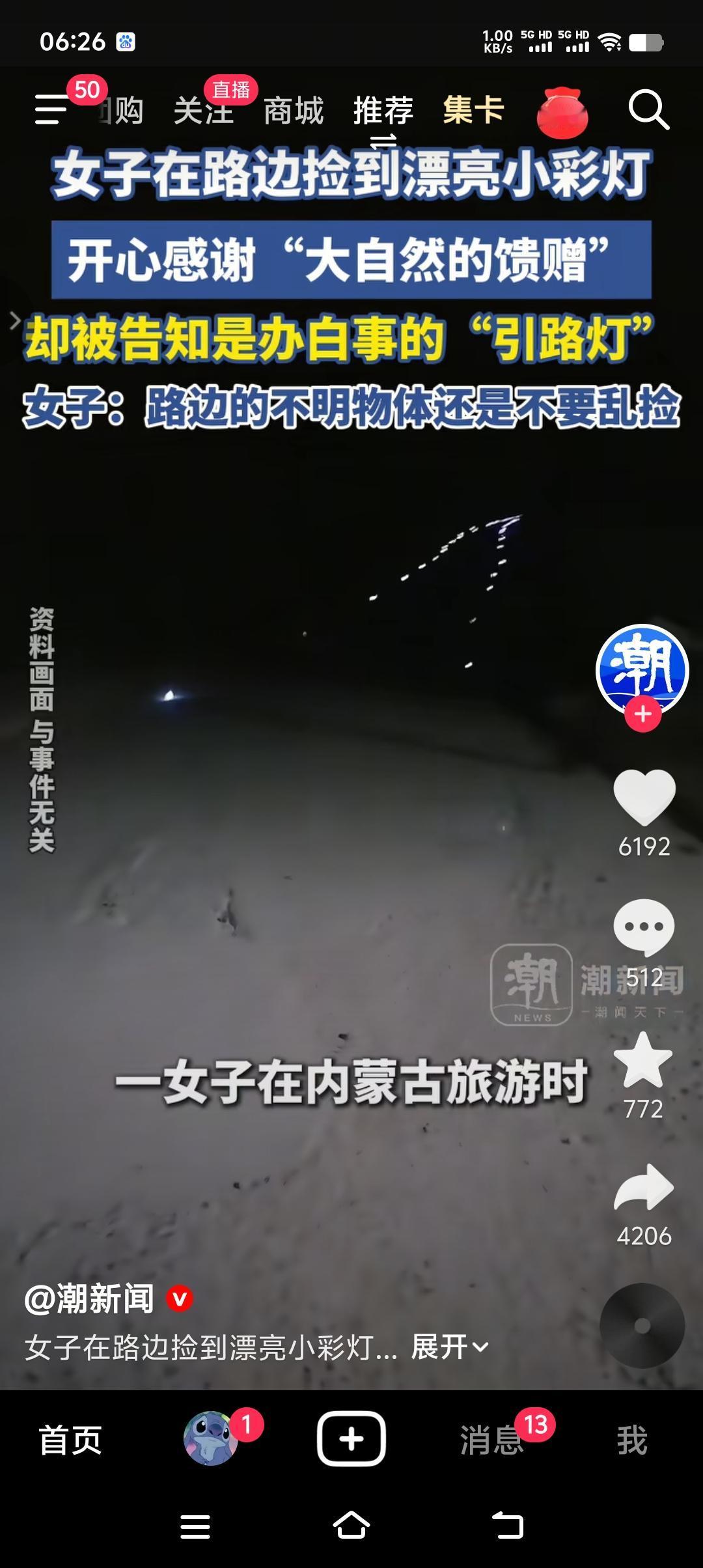 路上三不捡,1>十字路口的钱不捡,那是替人消灾钱,2>被人抛弃的玩偶和佛像不捡,会发生一些灵异现象,3>不明发光体不要捡,很有可能是丧事指路灯。 2月3号,一女子在内蒙旅游时,见到一路漂亮小彩灯,还以为是大自然的馈赠,开心的捡了好多。不料好心路人却提醒她,这是刚刚有人办丧事,给逝者放的丧事引给灯,女子得知后赶紧放回原地。 所以说马路上的不明物体尽量不要捡,天上不会掉馅儿饼,即便掉下来,也轮不到你捡。少一份好奇心,少一份贪婪,那么你就会远离一些不必要的是非。