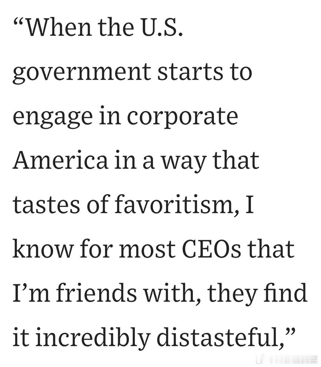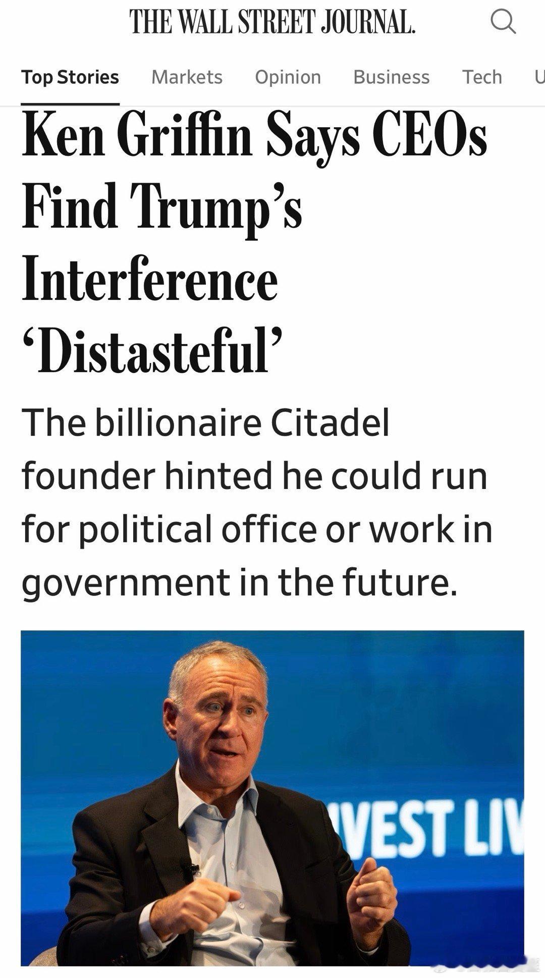 美国金融巨头Citadel的创始人,在论坛上公开批评现任总统:联邦政府干涉企业经营,让CEO们很不舒服…没人愿意“必须不断阿谀奉承政府官员”…很多决策是搞裙带关系、让亲友捞钱,太没品味…绝大多数CEO不敢表态,是害怕社交媒体…自己选择发声,是想把国家往“好的方向”助推