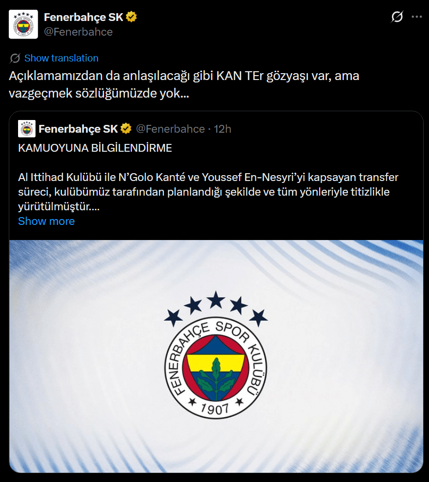 费内巴切官方转发了北京时间昨晚发布的一则确认交易告吹的公告,并配文:正如我们的声明所言,虽有血汗的泪水,但我们的字典里没有放弃一词!